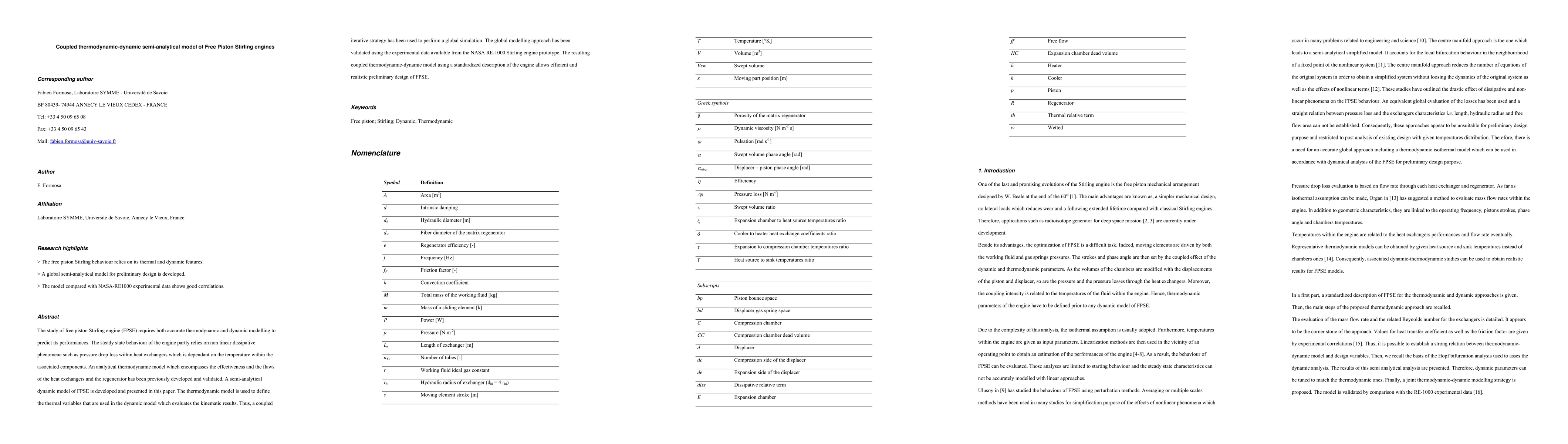This paper presents a coupled thermodynamic-dynamic semi-analytical model for the free piston Stirling engine (FPSE) that integrates both thermodynamic and dynamic aspects to predict performance. The model uses an iterative strategy validated against experimental data, enabling efficient preliminary design.