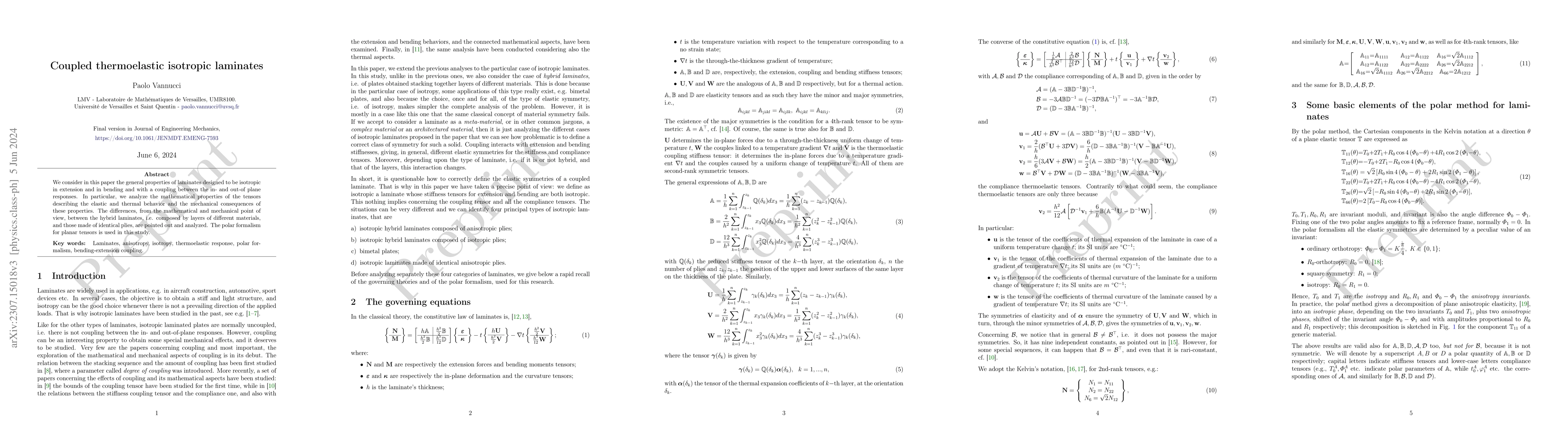 This paper investigates isotropic laminates with coupled thermoelastic behavior, comparing hybrid laminates with different materials to those of identical plies. It uses polar formalism to analyze the mathematical and mechanical properties of the tensors describing their elastic and thermal responses.