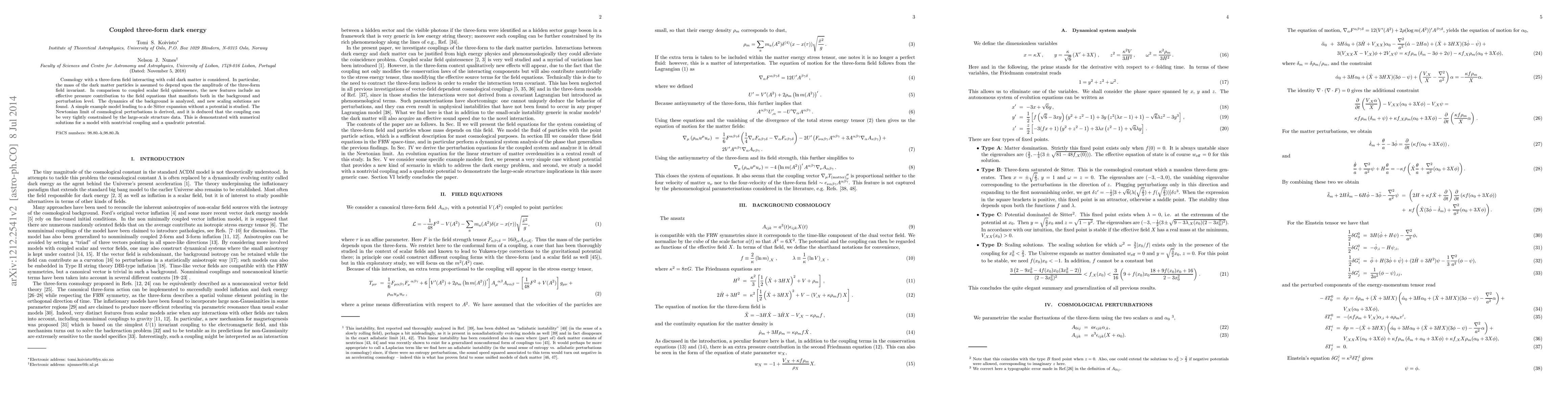 This research explores cosmology with a three-form field interacting with cold dark matter, where dark matter particle mass depends on the three-form field's amplitude. New features include an effective pressure contribution in field equations, with novel scaling solutions found. A simple model leading to de Sitter expansion without a potential is analyzed. The Newtonian limit of cosmological perturbations is derived, showing tight constraints on coupling from large-scale structure data. These findings are demonstrated through numerical solutions for a model with nontrivial coupling and quadratic potential.