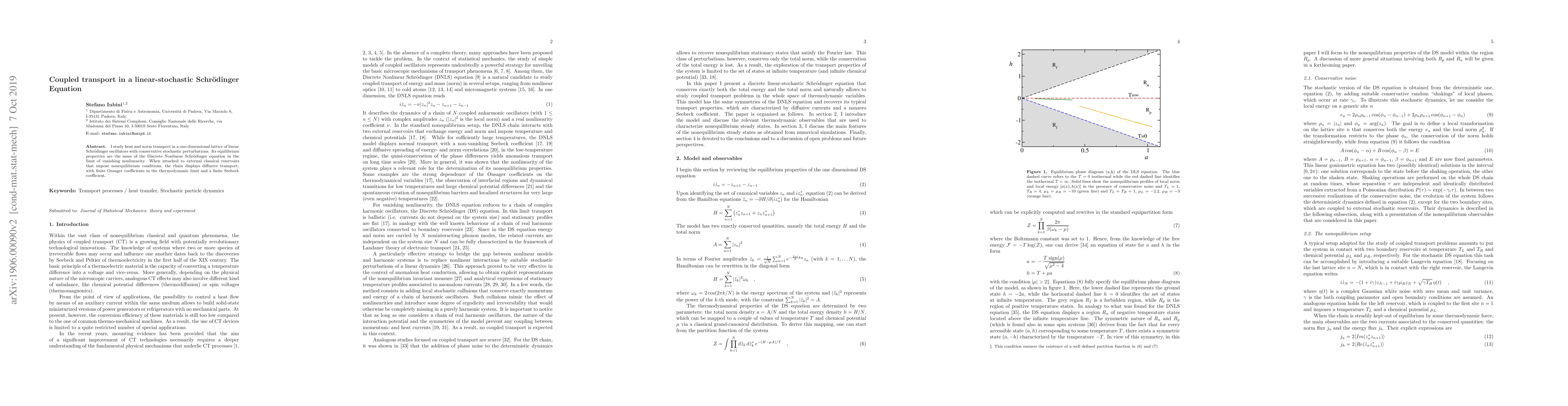 This paper investigates heat and norm transport in a one-dimensional lattice of linear Schrödinger oscillators subjected to conservative stochastic perturbations, revealing equilibrium properties akin to the Discrete Nonlinear Schrödinger equation in the absence of nonlinearity. Under nonequilibrium conditions imposed by external reservoirs, the system exhibits diffusive transport, with finite Onsager coefficients and a finite Seebeck coefficient in the thermodynamic limit.