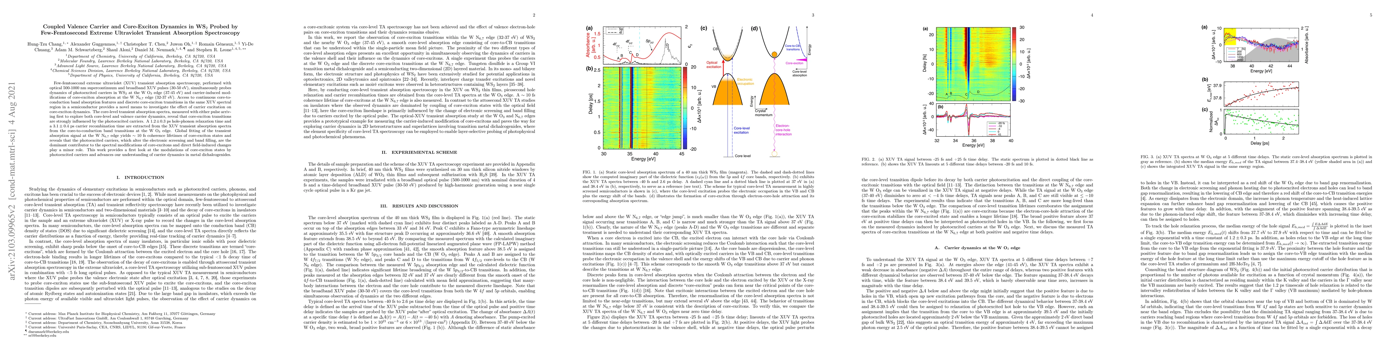 Few-femtosecond extreme ultraviolet (XUV) transient absorption spectroscopy, performed with optical 500-1000 nm supercontinuum and broadband XUV pulses (30-50 eV), simultaneously probes dynamics of photoexcited carriers in WS$_{2}$ at the W O$_3$ edge (37-45 eV) and carrier-induced modifications of core-exciton absorption at the W N$_{6,7}$ edge (32-37 eV). Access to continuous core-to-conduction band absorption features and discrete core-exciton transitions in the same XUV spectral region in a semiconductor provides a novel means to investigate the effect of carrier excitation on core-exciton dynamics. The core-level transient absorption spectra, measured with either pulse arriving first to explore both core-level and valence carrier dynamics, reveal that core-exciton transitions are strongly influenced by the photoexcited carriers. A $1.2\pm0.3$ ps hole-phonon relaxation time and a $3.1\pm0.4$ ps carrier recombination time are extracted from the XUV transient absorption spectra from the core-to-conduction band transitions at the W O$_{3}$ edge. Global fitting of the transient absorption signal at the W N$_{6,7}$ edge yields $\sim 10$ fs coherence lifetimes of core-exciton states and reveals that the photoexcited carriers, which alter the electronic screening and band filling, are the dominant contributor to the spectral modifications of core-excitons and direct field-induced changes play a minor role. This work provides a first look at the modulations of core-exciton states by photoexcited carriers and advances our understanding of carrier dynamics in metal dichalcogenides.