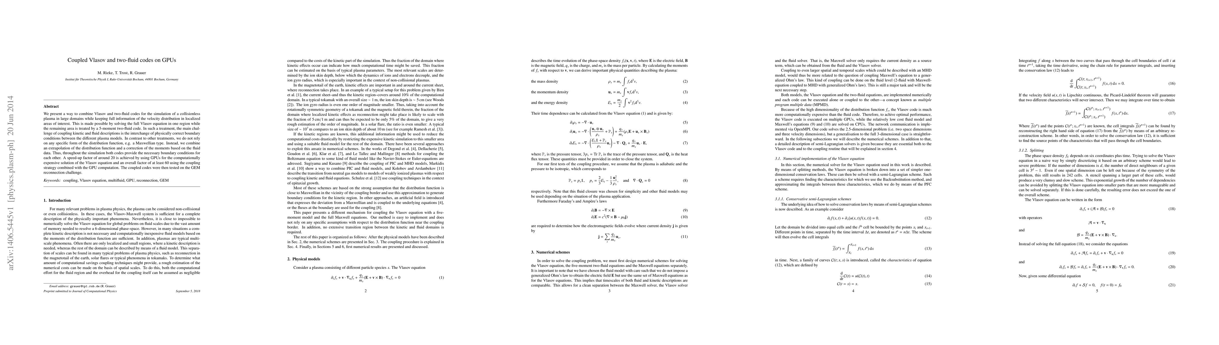 Researchers developed a method to combine Vlasov and two-fluid codes for simulating plasma dynamics on GPUs, achieving a 20x speed-up factor, and successfully tested it on the GEM reconnection challenge.