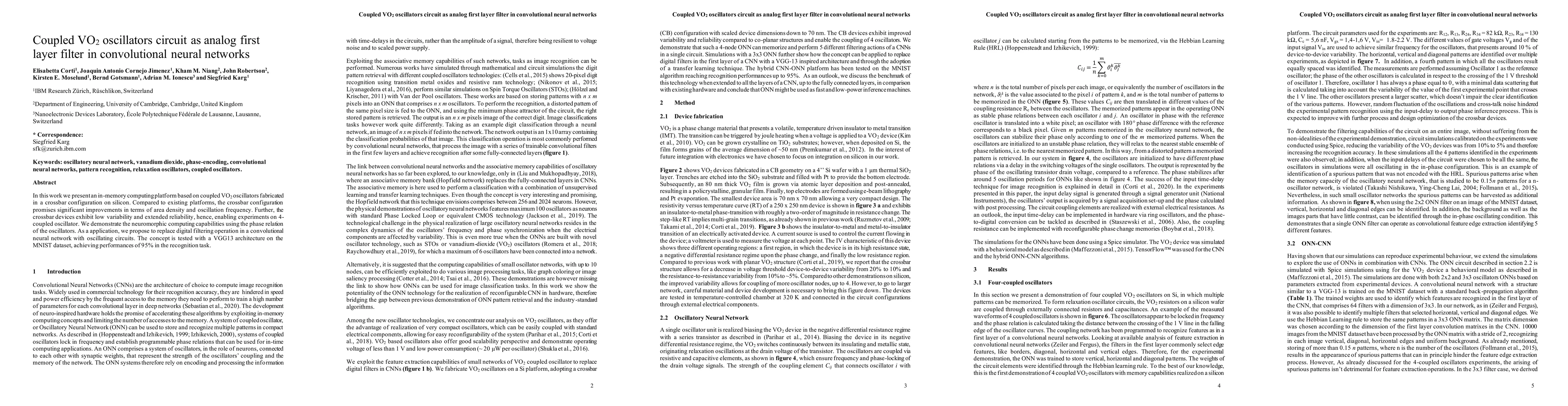 This paper introduces a novel in-memory computing platform using coupled VO2 oscillators in a crossbar configuration to enhance convolutional neural networks. The proposed oscillators achieve significant improvements in area density and frequency, enabling efficient analog first-layer filtering and demonstrating 95% recognition performance on the MNIST dataset with a VGG13 architecture.