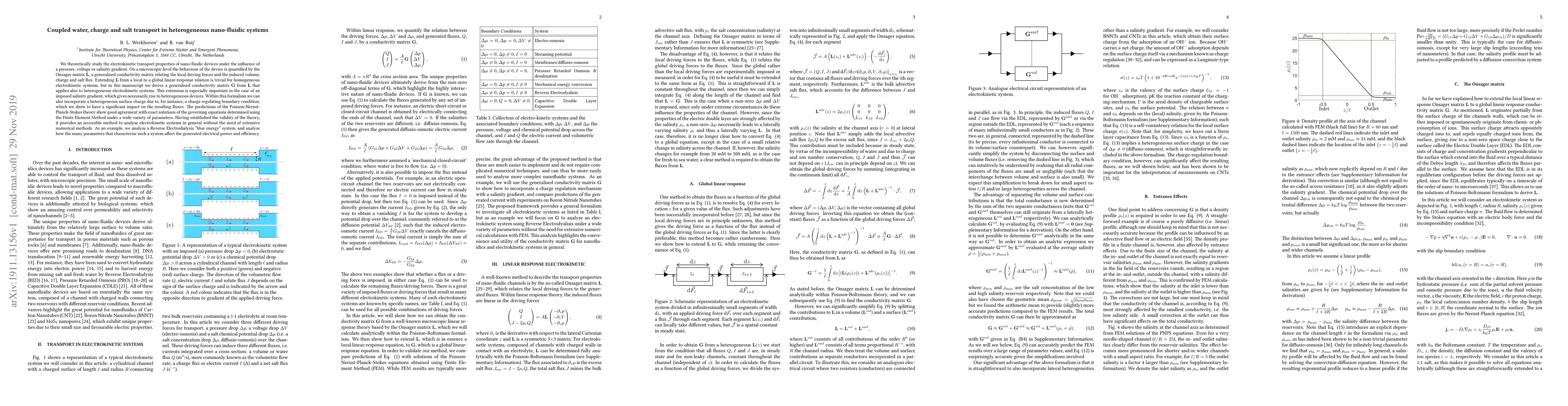 We theoretically study the electrokinetic transport properties of nano-fluidic devices under the influence of a pressure, voltage or salinity gradient. On a microscopic level the behaviour of the device is quantified by the Onsager matrix ${\bf L}$, a generalised conductivity matrix relating the local driving forces and the induced volume, charge and salt flux. Extending ${\bf L}$ from a local to a global linear-response relation is trivial for homogeneous electrokinetic systems, but in this manuscript we derive a generalised conductivity matrix ${\bf G}$ from ${\bf L}$ that applies also to heterogeneous electrokinetic systems. This extension is especially important in the case of an imposed salinity gradient, which gives necessarily rise to heterogeneous devices. Within this formalism we can also incorporate a heterogeneous surface charge due to, for instance, a charge regulating boundary condition, which we show to have a significant impact on the resulting fluxes. The predictions of the Poisson-Nernst-Planck-Stokes theory show good agreement with exact solutions of the governing equations determined using the Finite Element Method under a wide variety of parameters. Having established the validity of the theory, it provides an accessible method to analyse electrokinetic systems in general without the need of extensive numerical methods. As an example, we analyse a Reverse Electrodialysis "blue energy" system, and analyse how the many parameters that characterise such a system affect the generated electrical power and efficiency.