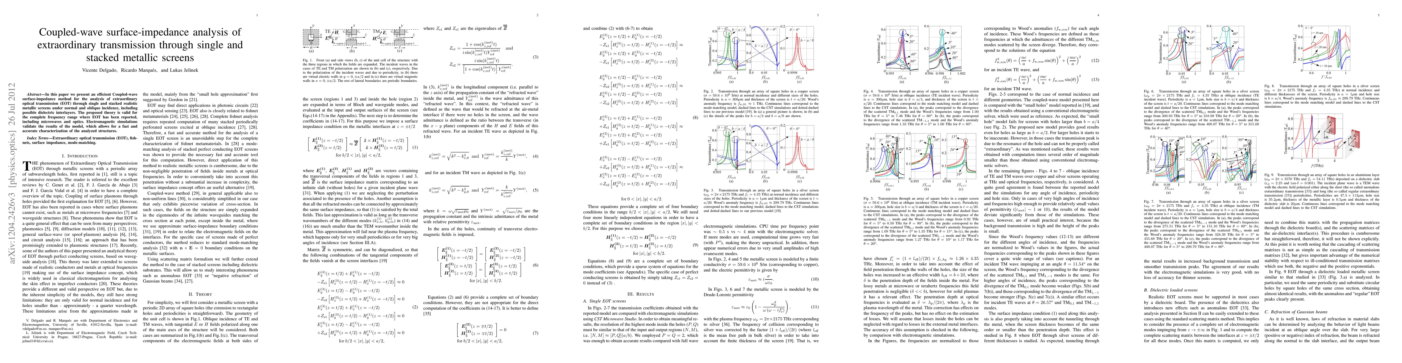 The paper introduces a coupled-wave surface-impedance method with approximate boundary conditions for efficient analysis of EOT through metallic screens, extending to dielectric-loaded and stacked structures.