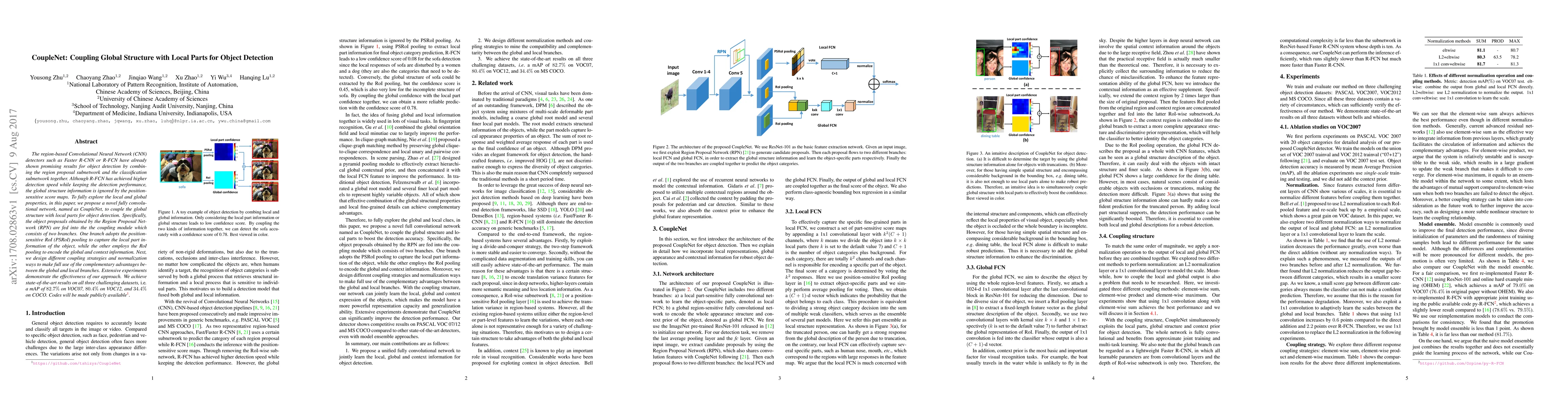 CoupleNet proposes a novel fully convolutional network to combine global structure information with local part details for enhanced object detection. By employing a coupling module with two branches—one capturing local parts and the other encoding global context—the method achieves state-of-the-art results on VOC07, VOC12, and COCO datasets.