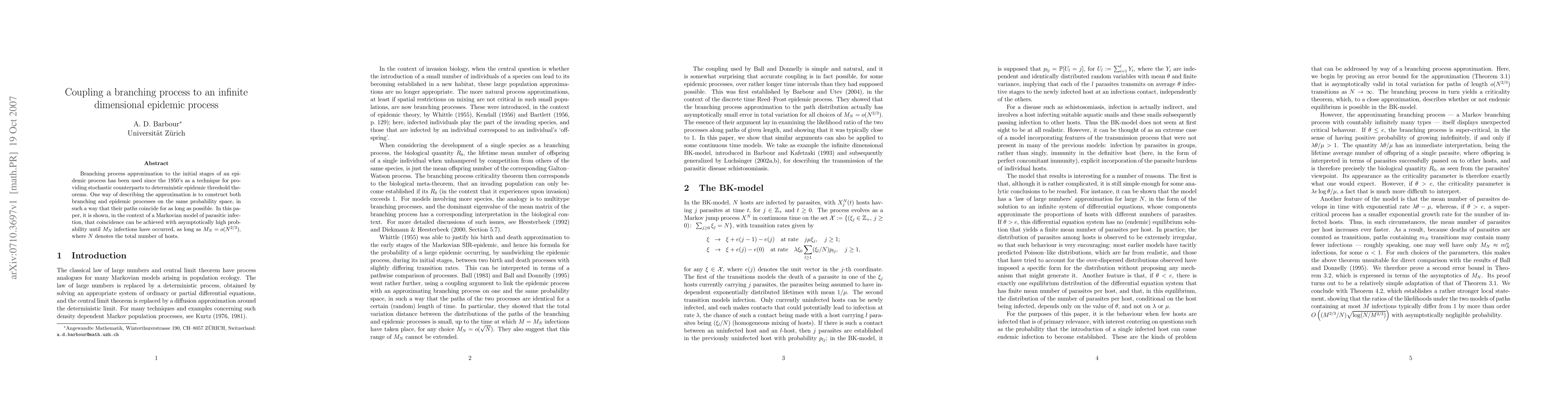 Researchers showed that in a Markovian model of parasitic infection, two processes (branching process and epidemic process) can coincide for a large number of infections with high probability until around o(N^{2/3}) infections occur.