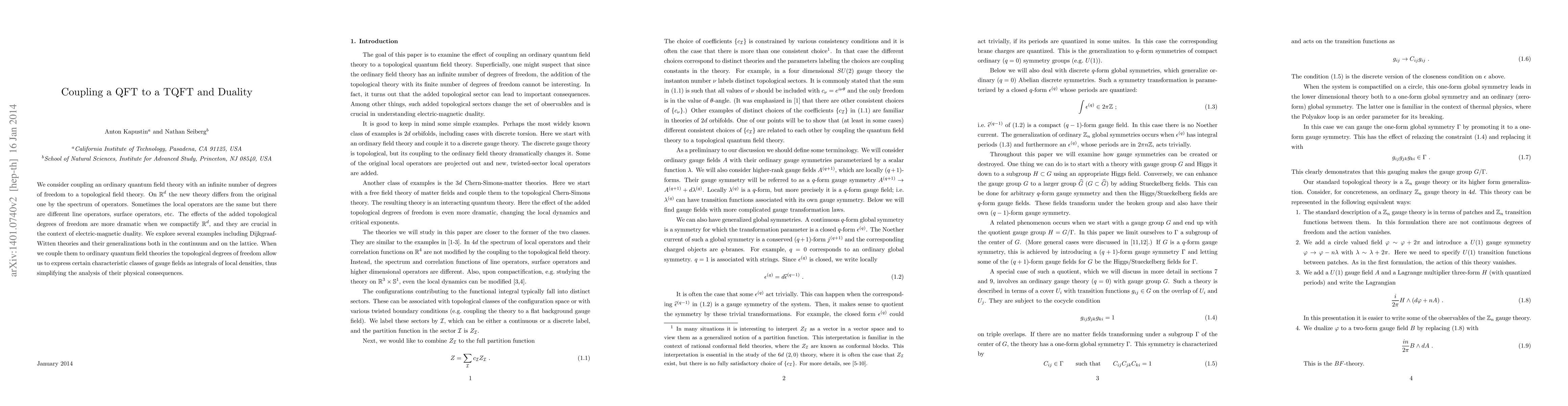 We consider coupling an ordinary quantum field theory with an infinite number of degrees of freedom to a topological field theory. On R^d the new theory differs from the original one by the spectrum of operators. Sometimes the local operators are the same but there are different line operators, surface operators, etc. The effects of the added topological degrees of freedom are more dramatic when we compactify R^d, and they are crucial in the context of electric-magnetic duality. We explore several examples including Dijkgraaf-Witten theories and their generalizations both in the continuum and on the lattice. When we couple them to ordinary quantum field theories the topological degrees of freedom allow us to express certain characteristic classes of gauge fields as integrals of local densities, thus simplifying the analysis of their physical consequences.