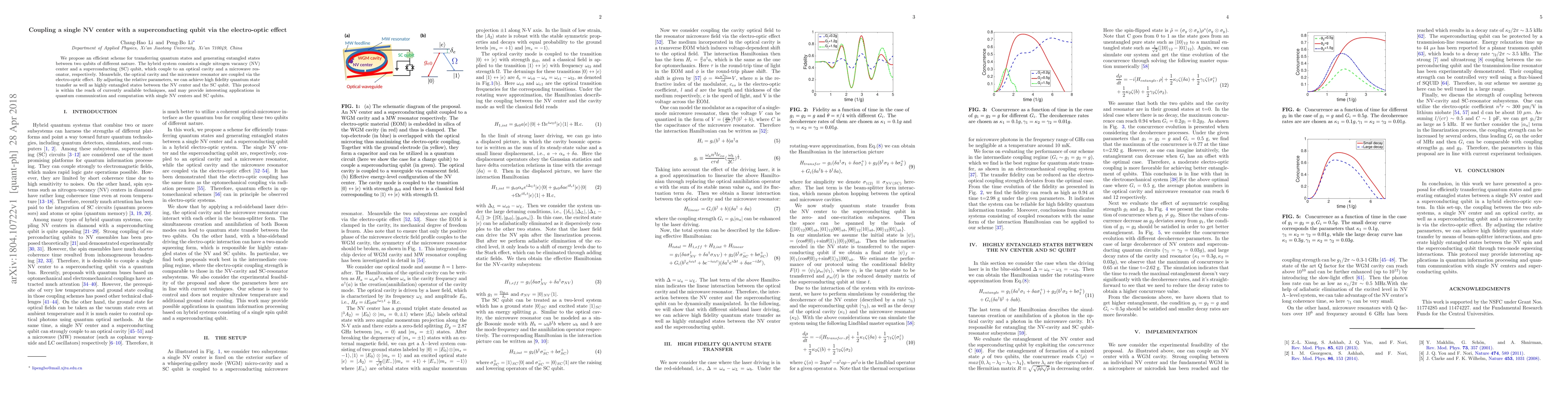 This paper proposes an efficient method to transfer quantum states and generate entangled states between a nitrogen vacancy (NV) center and a superconducting qubit using the electro-optic effect to couple an optical cavity and a microwave resonator. The protocol is feasible with current technology and holds potential for quantum communication and computation.