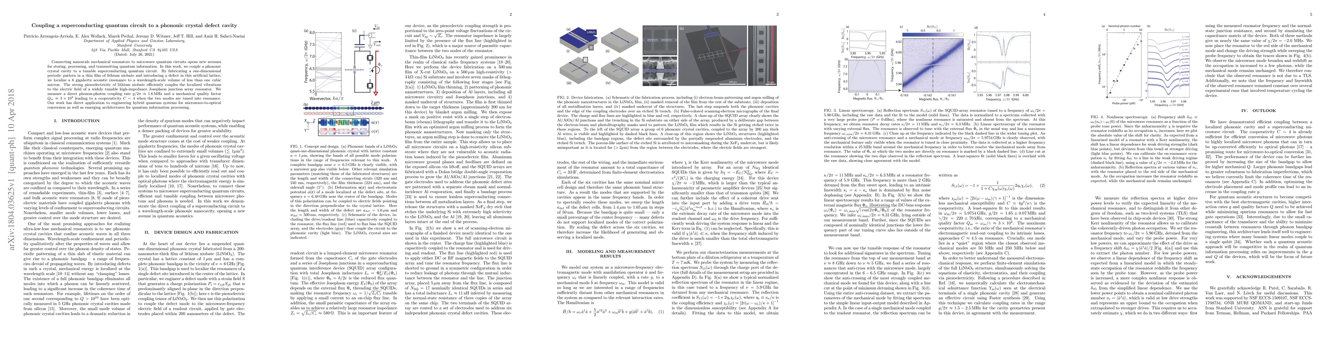 Connecting nanoscale mechanical resonators to microwave quantum circuits opens new avenues for storing, processing, and transmitting quantum information. In this work, we couple a phononic crystal cavity to a tunable superconducting quantum circuit. By fabricating a one-dimensional periodic pattern in a thin film of lithium niobate and introducing a defect in this artificial lattice, we localize a 6 gigahertz acoustic resonance to a wavelength-scale volume of less than one cubic micron. The strong piezoelectricity of lithium niobate efficiently couples the localized vibrations to the electric field of a widely tunable high-impedance Josephson junction array resonator. We measure a direct phonon-photon coupling rate $g/2\pi \approx 1.6 \, \mathrm{MHz}$ and a mechanical quality factor $Q_\mathrm{m} \approx 3 \times 10^4$ leading to a cooperativity $C\sim 4$ when the two modes are tuned into resonance. Our work has direct application to engineering hybrid quantum systems for microwave-to-optical conversion as well as emerging architectures for quantum information processing.