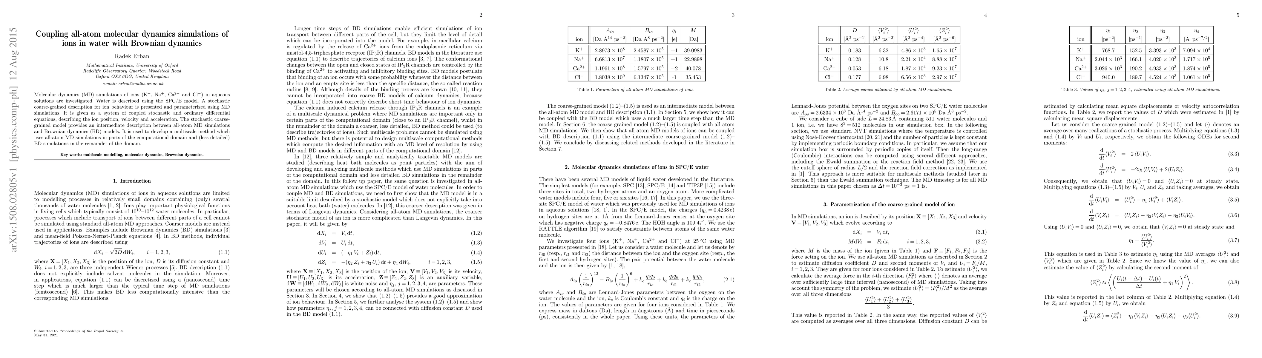 This paper develops a multiscale method combining all-atom molecular dynamics simulations of ions in water with Brownian dynamics, using a stochastic coarse-grained model to bridge the two approaches. The method employs detailed MD simulations in specific regions and less detailed BD simulations elsewhere for efficient computation.