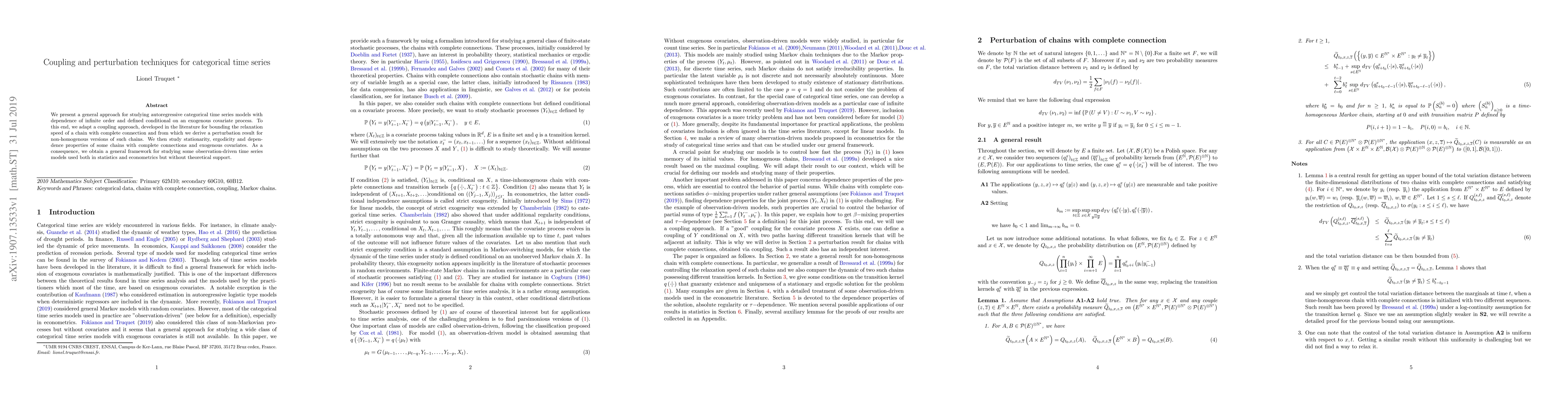 We present a general approach for studying autoregressive categorical time series models with dependence of infinite order and defined conditional on an exogenous covariate process. To this end, we adapt a coupling approach, developed in the literature for bounding the relaxation speed of a chain with complete connection and from which we derive a perturbation result for non-homogenous versions of such chains. We then study stationarity, ergodicity and dependence properties of some chains with complete connections and exogenous covariates. As a consequence, we obtain a general framework for studying some observation-driven time series models used both in statistics and econometrics but without theoretical support.