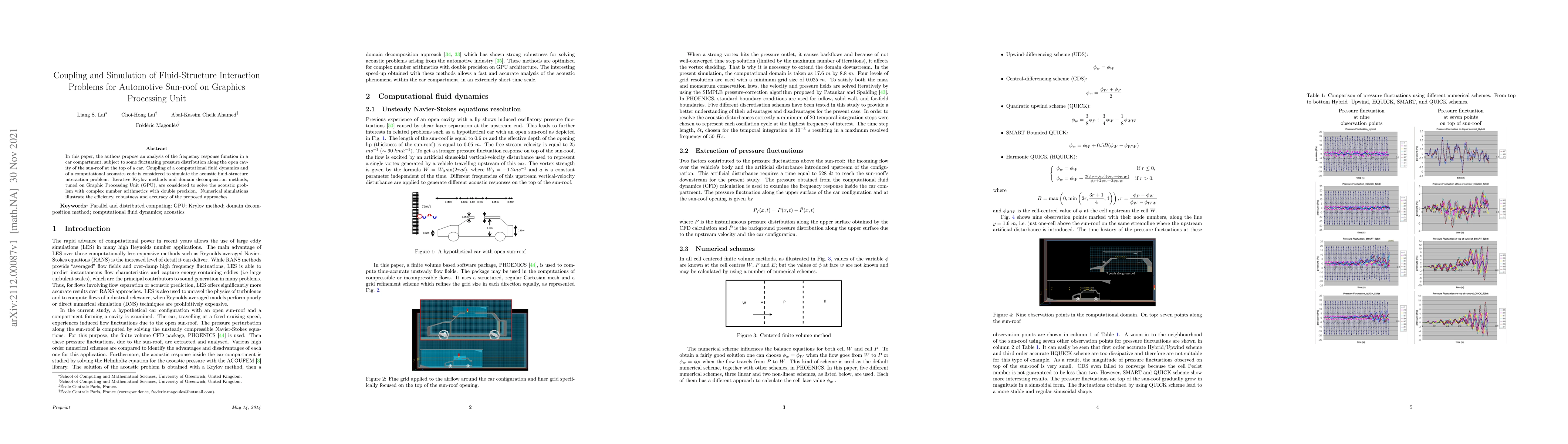 This paper proposes a method for simulating fluid-structure interaction in a car sun-roof using coupled computational fluid dynamics and acoustics codes. The study leverages GPU-based iterative and domain decomposition methods to solve the complex acoustic problem efficiently, demonstrating the approach's accuracy and robustness through numerical simulations.