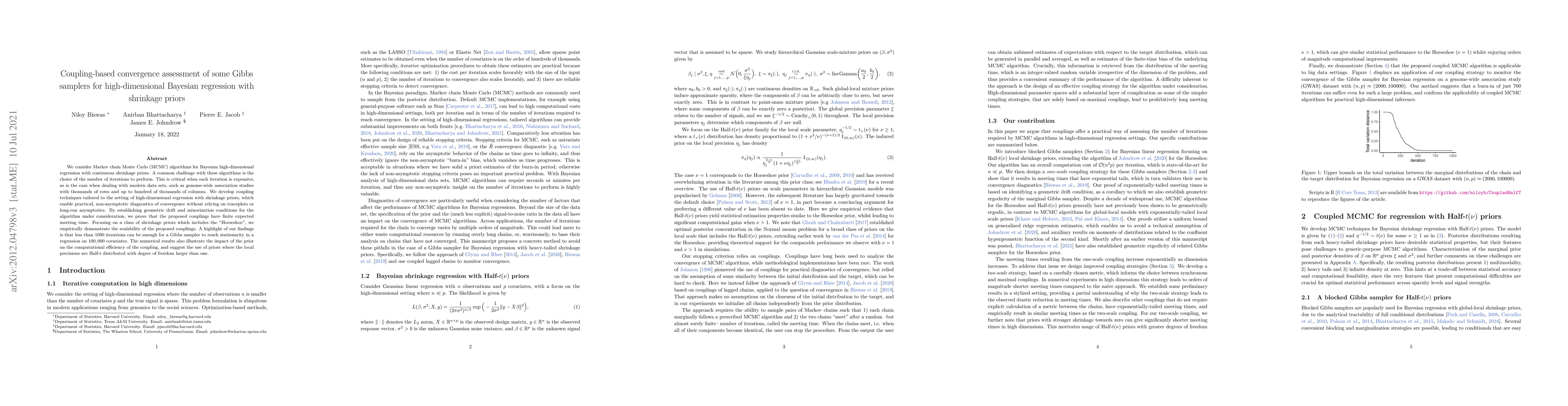 This paper develops coupling-based convergence diagnostics for Gibbs samplers in high-dimensional Bayesian regression with shrinkage priors, proving finite expected meeting time and demonstrating that fewer than 1000 iterations can suffice for convergence in large datasets, highlighting the efficiency of priors with Half-t distributed local precisions.