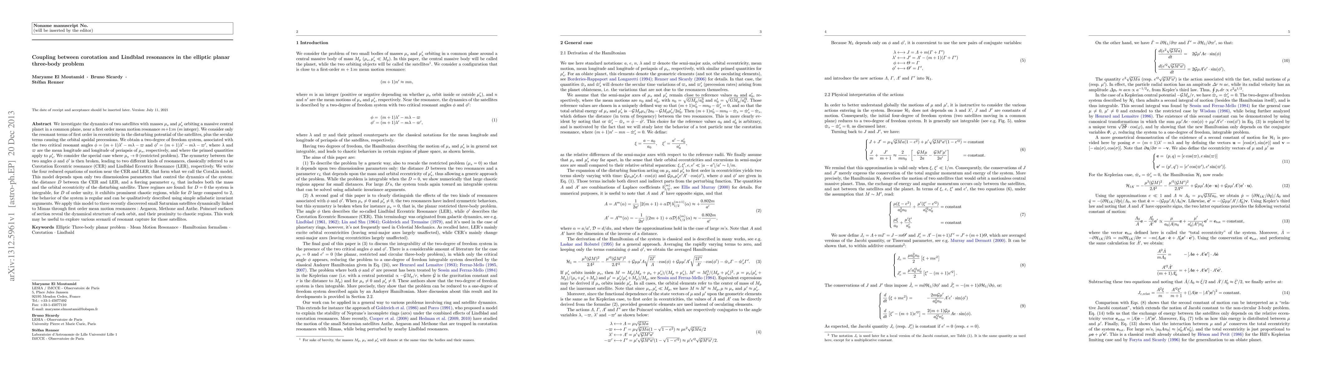 We investigate the dynamics of two satellites with masses $\mu_s$ and $\mu'_s$ orbiting a massive central planet in a common plane, near a first order mean motion resonance $m$+1:$m$ ($m$ integer). We consider only the resonant terms of first order in eccentricity in the disturbing potential of the satellites, plus the secular terms causing the orbital apsidal precessions. We obtain a two-degree of freedom system, associated with the two critical resonant angles $\phi= (m+1)\lambda' -m\lambda - \varpi$ and $\phi'= (m+1)\lambda' -m\lambda - \varpi'$, where $\lambda$ and $\varpi$ are the mean longitude and longitude of periapsis of $\mu_s$, respectively, and where the primed quantities apply to $\mu'_s$. We consider the special case where $\mu_s \rightarrow 0$ (restricted problem). The symmetry between the two angles $\phi$ and $\phi'$ is then broken, leading to two different kinds of resonances, classically referred to as Corotation Eccentric resonance (CER) and Lindblad Eccentric Resonance (LER), respectively. We write the four reduced equations of motion near the CER and LER, that form what we call the CoraLin model. This model depends upon only two dimensionless parameters that control the dynamics of the system: the distance $D$ between the CER and LER, and a forcing parameter $\epsilon_L$ that includes both the mass and the orbital eccentricity of the disturbing satellite. Three regimes are found: for $D=0$ the system is integrable, for $D$ of order unity, it exhibits prominent chaotic regions, while for $D$ large compared to 2, the behavior of the system is regular and can be qualitatively described using simple adiabatic invariant arguments. We apply this model to three recently discovered small Saturnian satellites dynamically linked to Mimas through first order mean motion resonances : Aegaeon, Methone and Anthe.