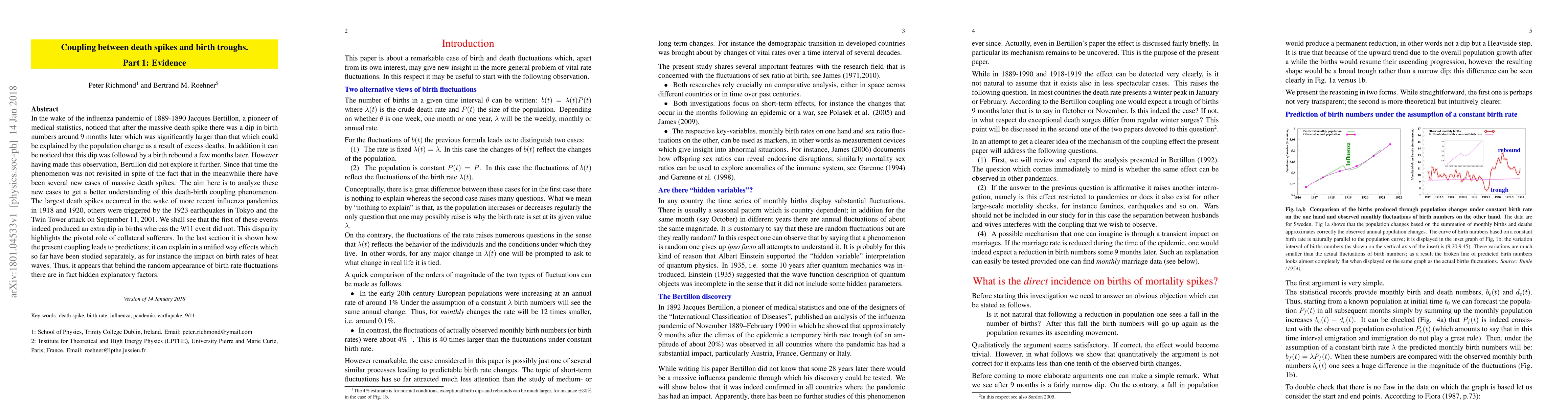 In the wake of the influenza pandemic of 1889-1890 Jacques Bertillon, a pioneer of medical statistics, noticed that after the massive death spike there was a dip in birth numbers around 9 months later which was significantly larger than that which could be explained by the population change as a result of excess deaths. In addition it can be noticed that this dip was followed by a birth rebound a few months later. However having made this observation, Bertillon did not explore it further. Since that time the phenomenon was not revisited in spite of the fact that in the meanwhile there have been several new cases of massive death spikes. The aim here is to analyze these new cases to get a better understanding of this death-birth coupling phenomenon. The largest death spikes occurred in the wake of more recent influenza pandemics in 1918 and 1920, others were triggered by the 1923 earthquakes in Tokyo and the Twin Tower attack on September 11, 2001. We shall see that the first of these events indeed produced an extra dip in births whereas the 9/11 event did not. This disparity highlights the pivotal role of collateral sufferers. In the last section it is shown how the present coupling leads to predictions; it can explain in a unified way effects which so far have been studied separately, as for instance the impact on birth rates of heat waves. Thus, it appears that behind the random appearance of birth rate fluctuations there are in fact hidden explanatory factors.
