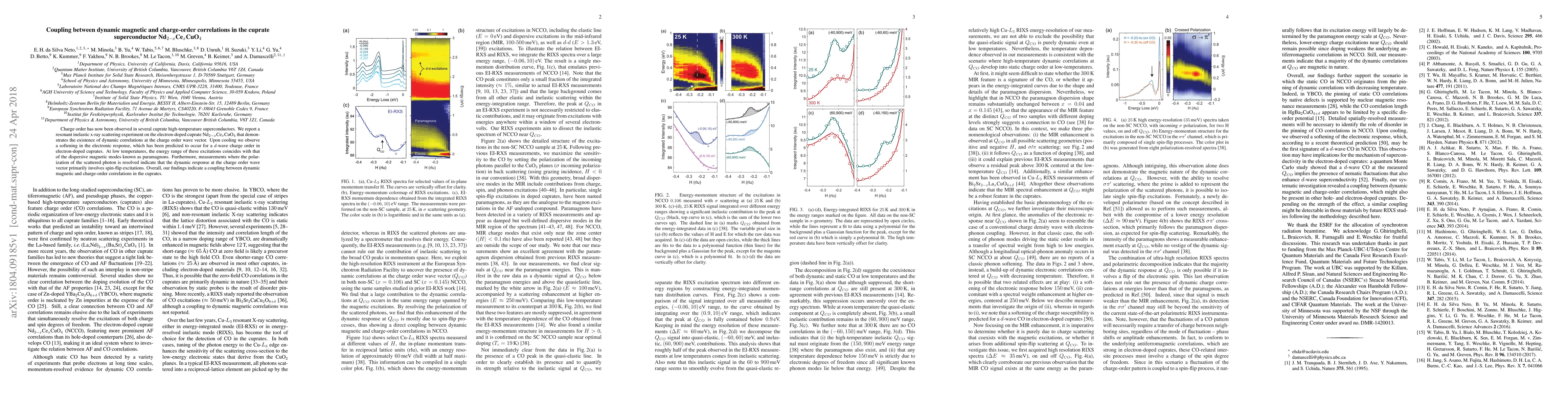 Charge order has now been observed in several cuprate high-temperature superconductors. We report a resonant inelastic x-ray scattering experiment on the electron-doped cuprate Nd$_{2-x}$Ce$_{x}$CuO$_4$ that demonstrates the existence of dynamic correlations at the charge order wave vector. Upon cooling we observe a softening in the electronic response, which has been predicted to occur for a d-wave charge order in electron-doped cuprates. At low temperatures, the energy range of these excitations coincides with that of the dispersive magnetic modes known as paramagnons. Furthermore, measurements where the polarization of the scattered photon is resolved indicate that the dynamic response at the charge order wave vector primarily involves spin-flip excitations. Overall, our findings indicate a coupling between dynamic magnetic and charge-order correlations in the cuprates.