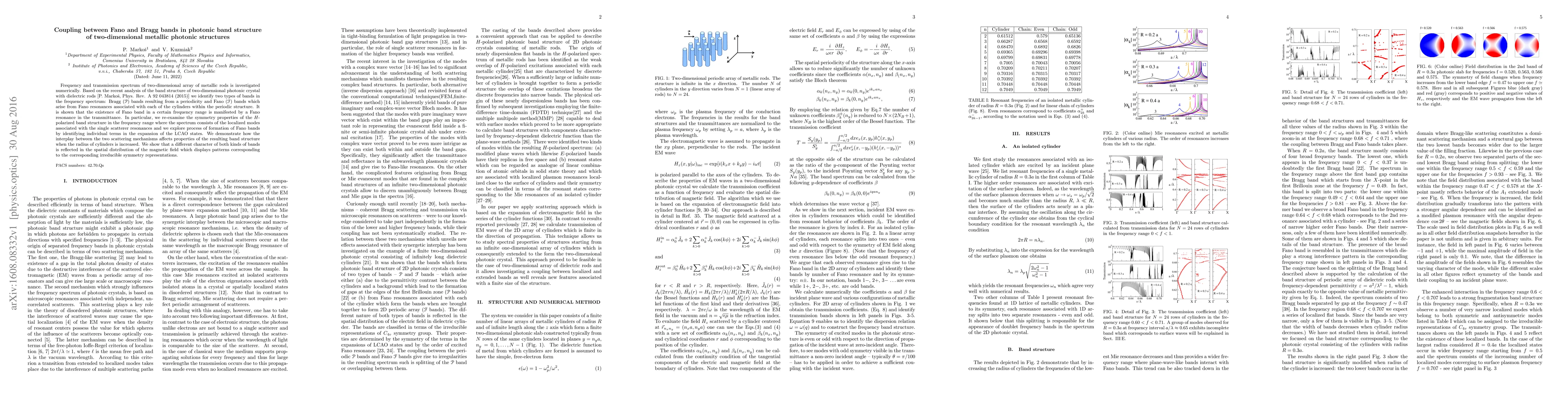 Frequency and transmission spectrum of two-dimensional array of metallic rods is investigated numerically. Based on the recent analysis of the band structure of two-dimensional photonic crystal with dielectric rods [P. Marko\v{s}, Phys. Rev. A 92 043814 (2015)] we identify two types of bands in the frequency spectrum: Bragg (P) bands resulting from a periodicity and Fano (F) bands which arise from Fano resonances associated with each of the cylinders within the periodic structure. It is shown that the existence of Fano band in a certain frequency range is manifested by a Fano resonance in the transmittance. In particular, we re-examine the symmetry properties of the H- polarized band structure in the frequency range where the spectrum consists of the localized modes associated with the single scatterer resonances and we explore process of formation of Fano bands by identifying individual terms in the expansion of the LCAO states. We demonstrate how the interplay between the two scattering mechanisms affects properties of the resulting band structure when the radius of cylinders is increased. We show that a different character of both kinds of bands is reflected in the spatial distribution of the magnetic field which displays patterns corresponding to the corresponding irreducible symmetry representations.