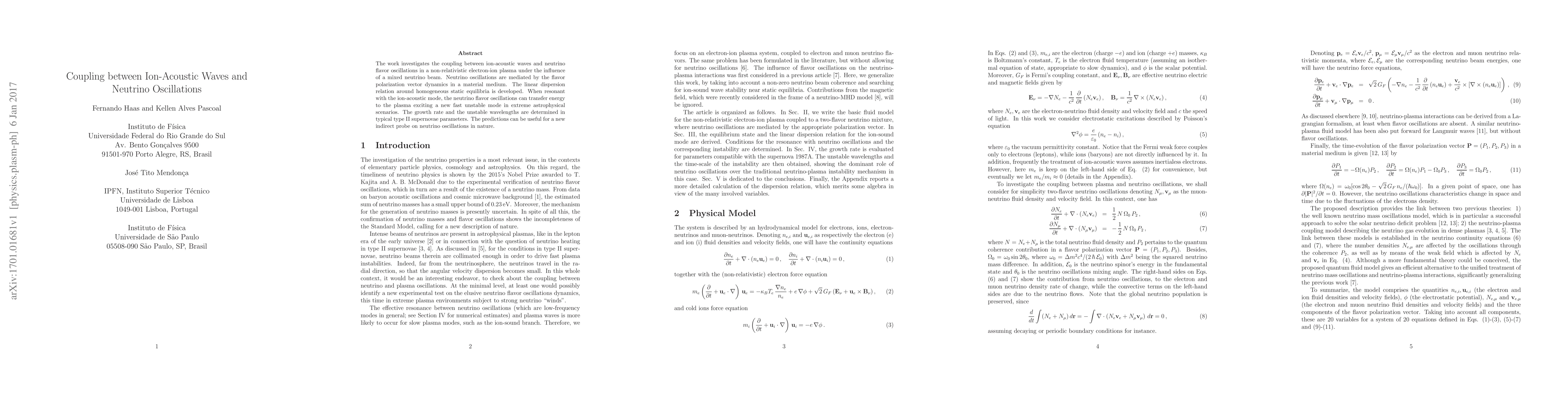 The work investigates the coupling between ion-acoustic waves and neutrino flavor oscillations in a non-relativistic electron-ion plasma under the influence of a mixed neutrino beam. Neutrino oscillations are mediated by the flavor polarization vector dynamics in a material medium. The linear dispersion relation around homogeneous static equilibria is developed. When resonant with the ion-acoustic mode, the neutrino flavor oscillations can transfer energy to the plasma exciting a new fast unstable mode in extreme astrophysical scenarios. The growth rate and the unstable wavelengths are determined in typical type II supernovae parameters. The predictions can be useful for a new indirect probe on neutrino oscillations in nature.