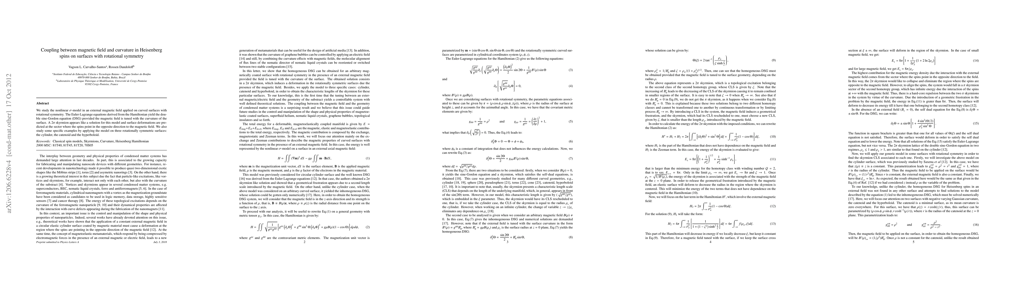 This research derives the double sine-Gordon equation for Heisenberg spins on curved surfaces with rotational symmetry under magnetic fields, predicting skyrmion formation and surface deformations. The study applies to surfaces like cylinders, catenoids, and hyperboloids, suggesting relevance to condensed matter systems such as superconductors and topological insulators.