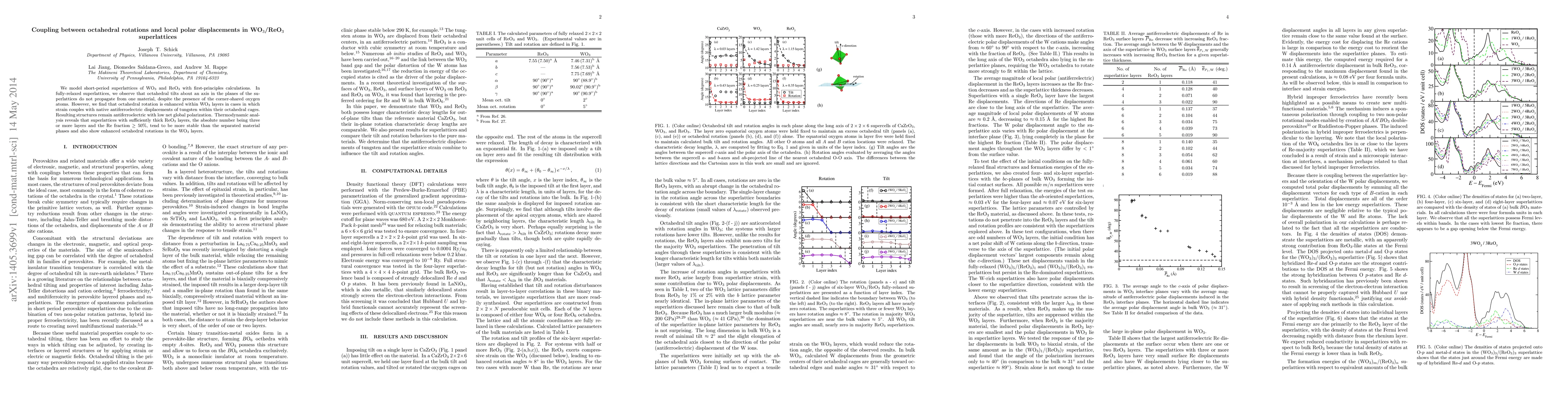 We model short-period superlattices of WO$_3$ and ReO$_3$ with first-principles calculations. In fully-relaxed superlattices, we observe that octahedral tilts about an axis in the planes of the superlattices do not propagate from one material, despite the presence of the corner-shared oxygen atoms. However, we find that octahedral rotation is enhanced within WO$_3$ layers in cases in which strain couples with native antiferroelectric displacements of tungsten within their octahedral cages. Resulting structures remain antiferroelectric with low net global polarization. Thermodynamic analysis reveals that superlattices with sufficiently thick ReO$_3$ layers, the absolute number being three or more layers and the Re fraction $\geq 50\%$, tend to be more stable than the separated material phases and also show enhanced octahedral rotations in the WO$_3$ layers.
