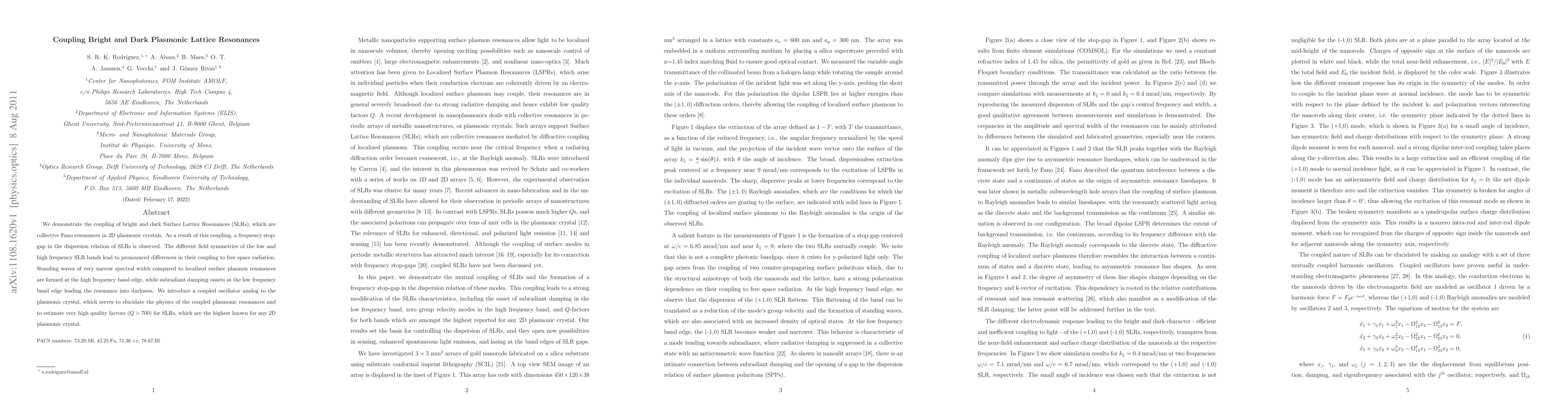 The paper demonstrates the coupling of bright and dark Surface Lattice Resonances in 2D plasmonic crystals, leading to a frequency stop-gap and very high quality factors (Q>700), the highest known for any 2D plasmonic crystal. The coupling results in narrow spectral widths at the high frequency band edge and subradiant damping at the low frequency band edge.
