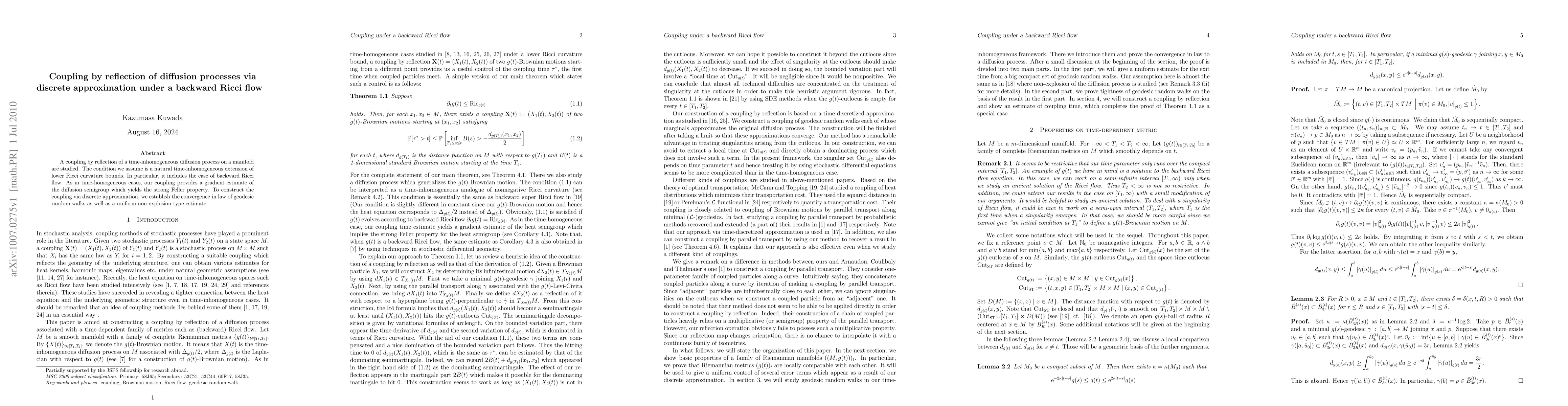 This paper studies a coupling method for time-inhomogeneous diffusion processes on manifolds, focusing on its application to backward Ricci flow, and establishes convergence in law and non-explosion estimates.