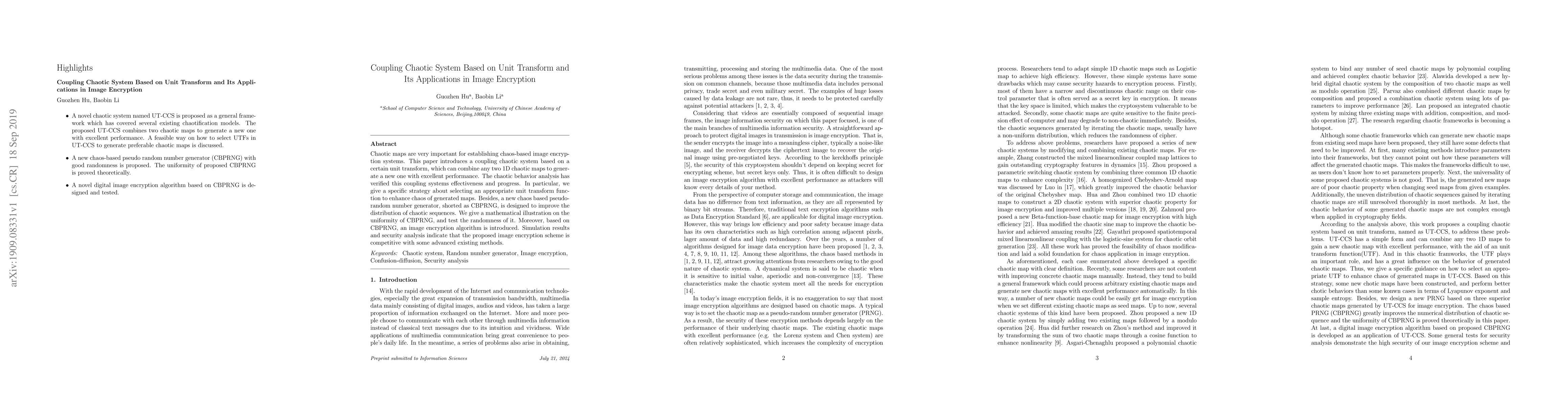 This paper proposes a coupling chaotic system based on a unit transform to combine two 1D chaotic maps, creating a new map with enhanced chaotic behavior. The study introduces a chaos-based pseudo-random number generator (CBPRNG) and an image encryption algorithm, demonstrating competitive security and performance compared to existing methods.