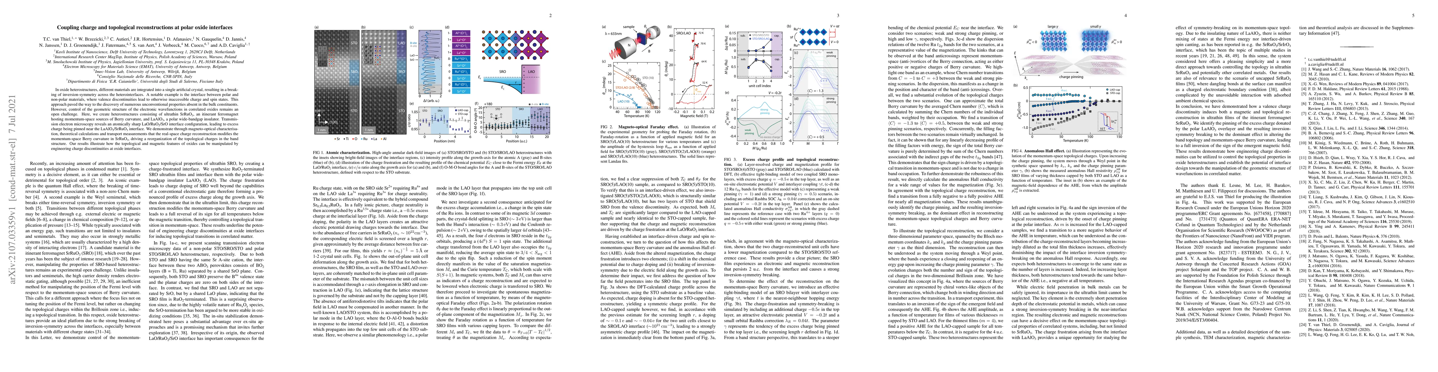 This paper investigates the coupling between charge and topological reconstructions at polar oxide interfaces, demonstrating how atomically sharp heterostructures of SrRuO$_3$ and LaAlO$_3$ lead to excess charge pinning and modify the momentum-space Berry curvature, thereby reorganizing topological charges in the band structure. The findings highlight the potential to manipulate topological and magnetic properties through engineered charge discontinuities.