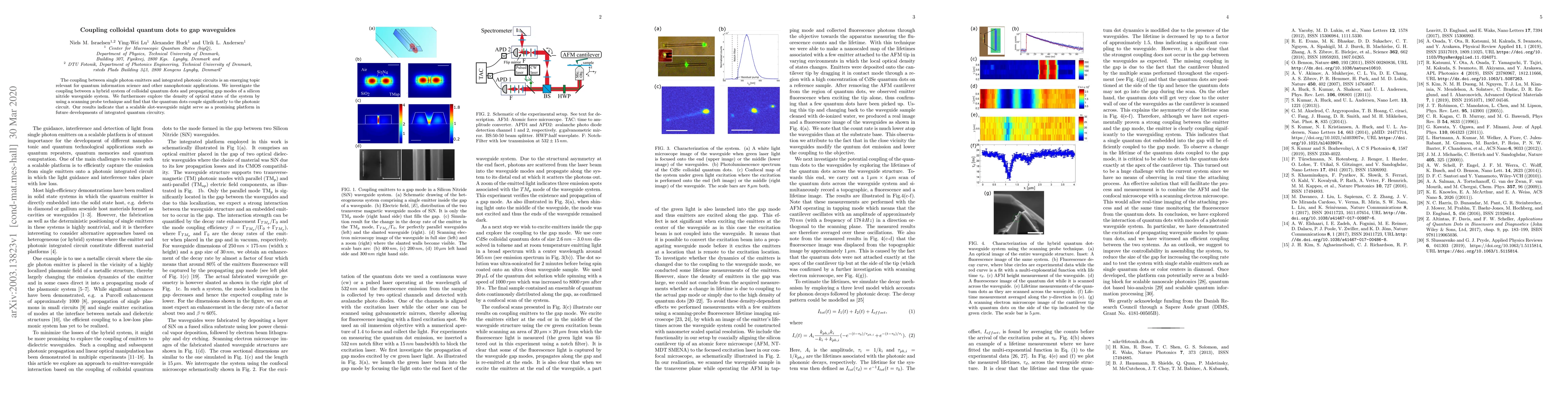 The coupling between single photon emitters and integrated photonic circuits is an emerging topic relevant for quantum information science and other nanophotonic applications. We investigate the coupling between a hybrid system of colloidal quantum dots and propagating gap modes of a silicon nitride waveguide system. We furthermore explore the density of optical states of the system by using a scanning probe technique and find that the quantum dots couple significantly to the photonic circuit. Our results indicate that a scalable slot-waveguide might serve as a promising platform in future developments of integrated quantum circuitry.