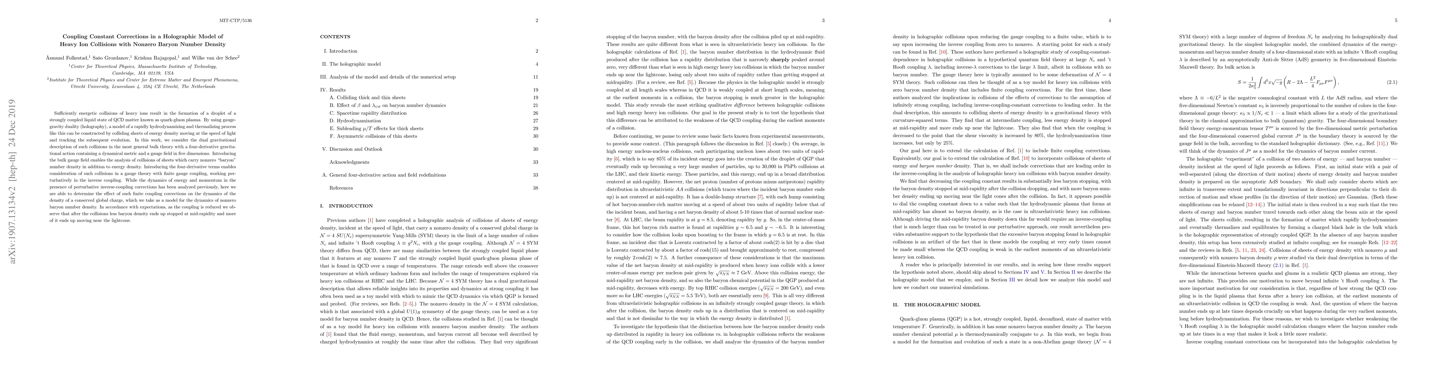 Sufficiently energetic collisions of heavy ions result in the formation of a droplet of a strongly coupled liquid state of QCD matter known as quark-gluon plasma. By using gauge-gravity duality (holography), a model of a rapidly hydrodynamizing and thermalizing process like this can be constructed by colliding sheets of energy density moving at the speed of light and tracking the subsequent evolution. In this work, we consider the dual gravitational description of such collisions in the most general bulk theory with a four-derivative gravitational action containing a dynamical metric and a gauge field in five dimensions. Introducing the bulk gauge field enables the analysis of collisions of sheets which carry nonzero "baryon" number density in addition to energy density. Introducing the four-derivative terms enables consideration of such collisions in a gauge theory with finite gauge coupling, working perturbatively in the inverse coupling. While the dynamics of energy and momentum in the presence of perturbative inverse-coupling corrections has been analyzed previously, here we are able to determine the effect of such finite coupling corrections on the dynamics of the density of a conserved global charge, which we take as a model for the dynamics of nonzero baryon number density. In accordance with expectations, as the coupling is reduced we observe that after the collisions less baryon density ends up stopped at mid-rapidity and more of it ends up moving near the lightcone.