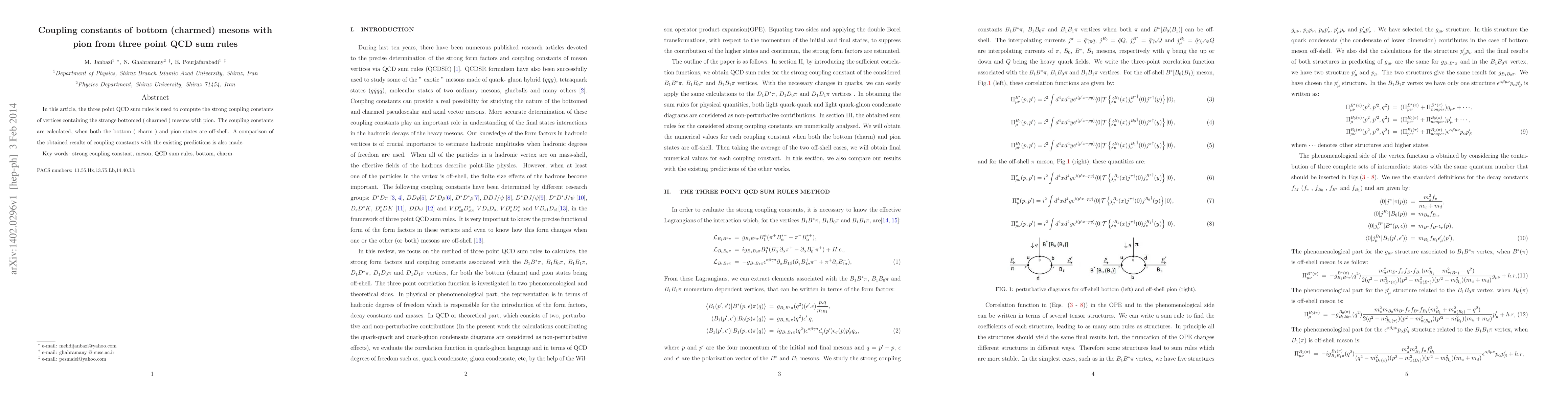 This paper utilizes three-point QCD sum rules to calculate the strong coupling constants for vertices involving strange bottom (charmed) mesons and pions, considering both off-shell states. The results are compared with existing predictions.