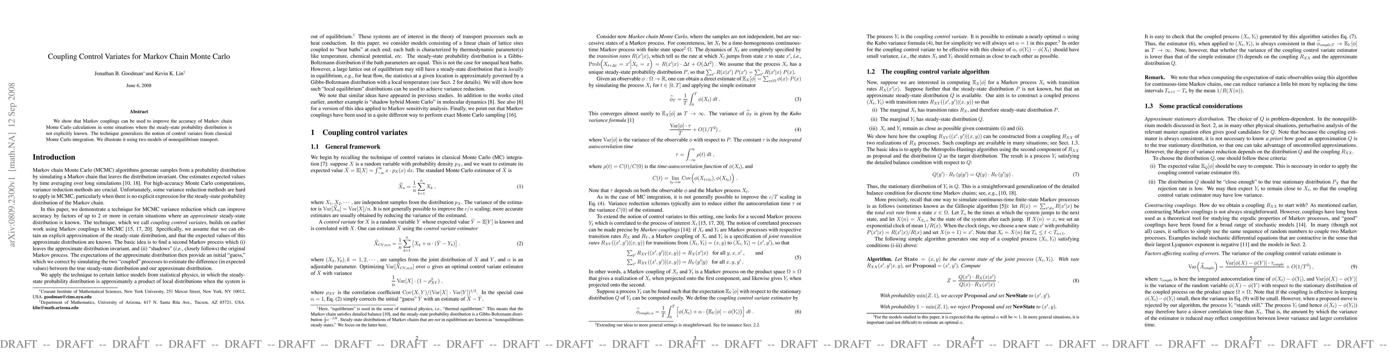This paper demonstrates how Markov couplings can enhance the accuracy of Markov chain Monte Carlo calculations when the steady-state distribution is unknown, extending the concept of control variates. The method is illustrated through two models of nonequilibrium transport.