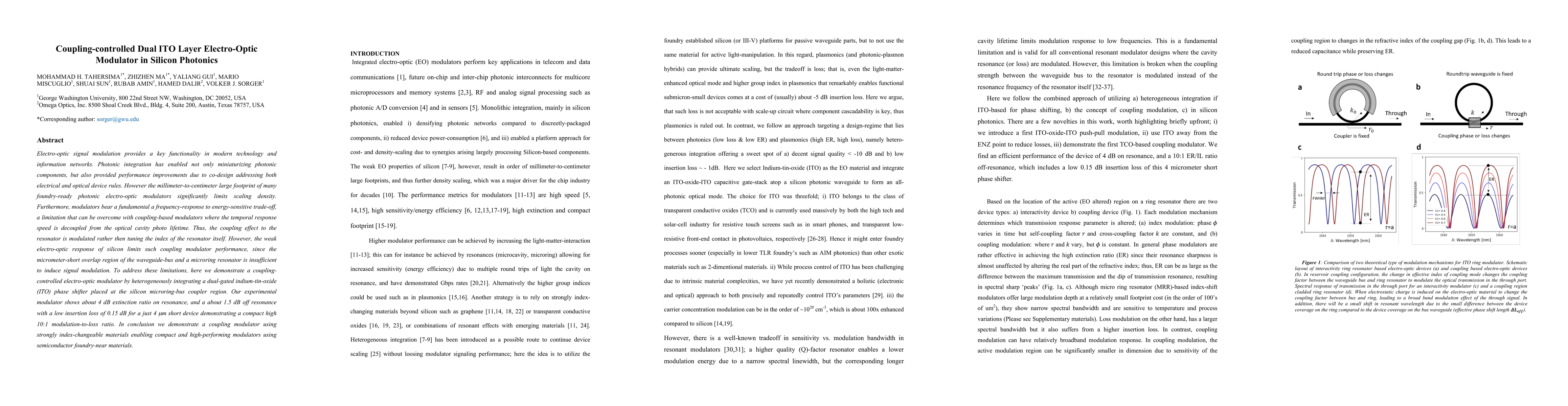 This research paper presents a coupling-controlled dual indium-tin-oxide (ITO) layer electro-optic modulator in silicon photonics, achieving a 4 dB extinction ratio on resonance and a 10:1 modulation-to-loss ratio in a compact 4 μm device. The dual-gated ITO phase shifter at the silicon microring-bus coupler enhances performance by decoupling temporal response from optical cavity photo lifetime.