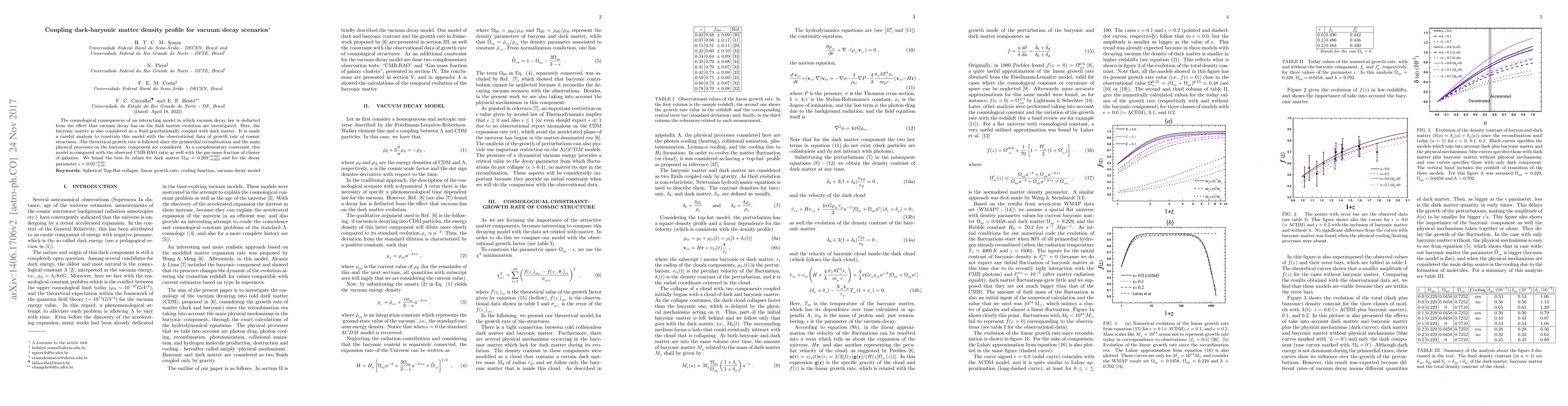 The cosmological consequences of an interacting model in which vacuum decay law is deducted from the effect that vacuum decay has on the dark matter evolution are investigated. Here, the baryonic matter is also considered as a fluid gravitationally coupled with dark matter. It is made a careful analysis to constrain this model with the observational data of growth rate of cosmic structures. The theoretical growth rate is followed since the primordial recombination and the main physical processes on the baryonic component are considered. As a complementary constraint, this model is compared with the observed CMB-BAO ratio as well with the gas mass fraction of cluster of galaxies. We found the best fit values for dark matter $\Omega_{d0} = 0.269 ^{+0.023}_{-0.023}$ and for the decay parameter $\epsilon = 0.02 ^{+0.04}_{-0.05}$.