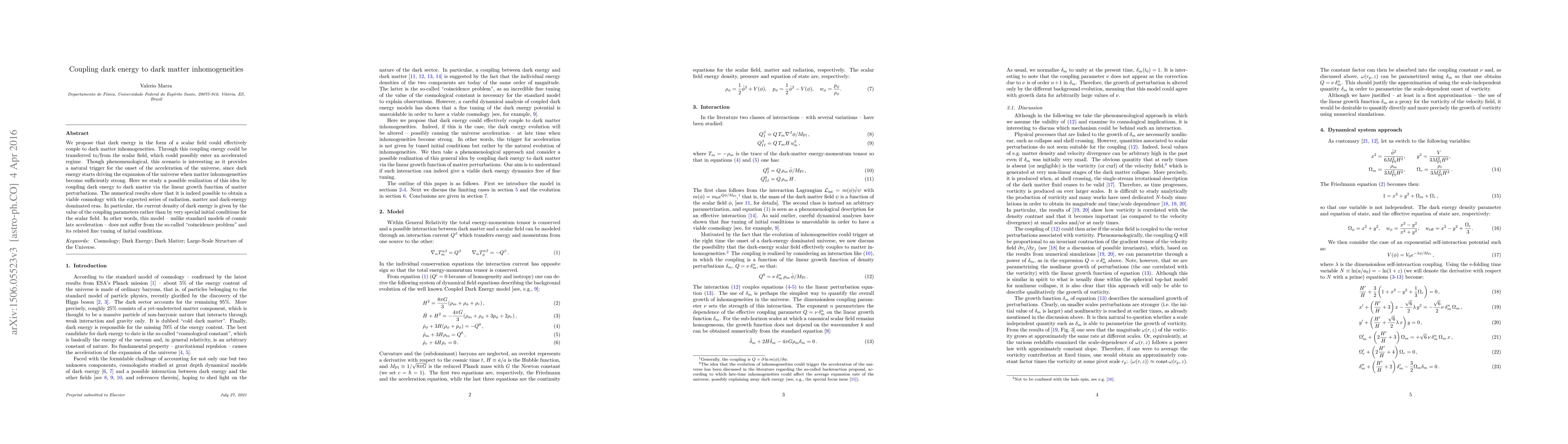 This paper proposes a model where dark energy, represented by a scalar field, couples to dark matter inhomogeneities, potentially triggering the universe's accelerated expansion. The model avoids the "coincidence problem" by deriving the current density of dark energy from coupling parameters rather than special initial conditions.