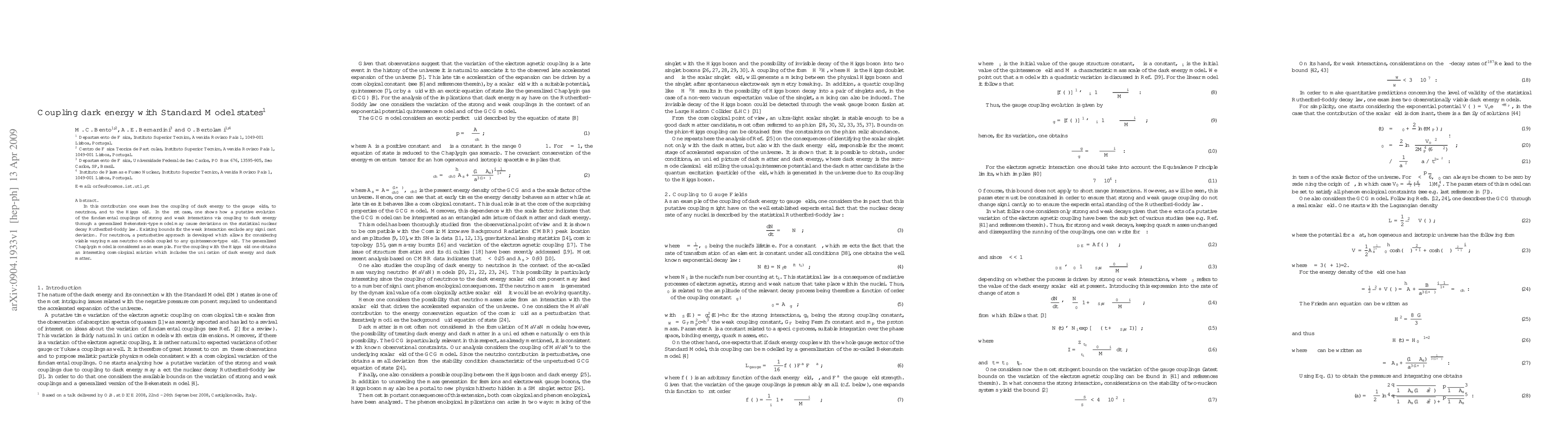 In this contribution one examines the coupling of dark energy to the gauge fields, to neutrinos, and to the Higgs field. In the first case, one shows how a putative evolution of the fundamental couplings of strong and weak interactions via coupling to dark energy through a generalized Bekenstein-type model may cause deviations on the statistical nuclear decay Rutherford-Soddy law. Existing bounds for the weak interaction exclude any significant deviation. For neutrinos, a perturbative approach is developed which allows for considering viable varying mass neutrino models coupled to any quintessence-type field. The generalized Chaplygin model is considered as an example. For the coupling with the Higgs field one obtains an interesting cosmological solution which includes the unification of dark energy and dark matter.