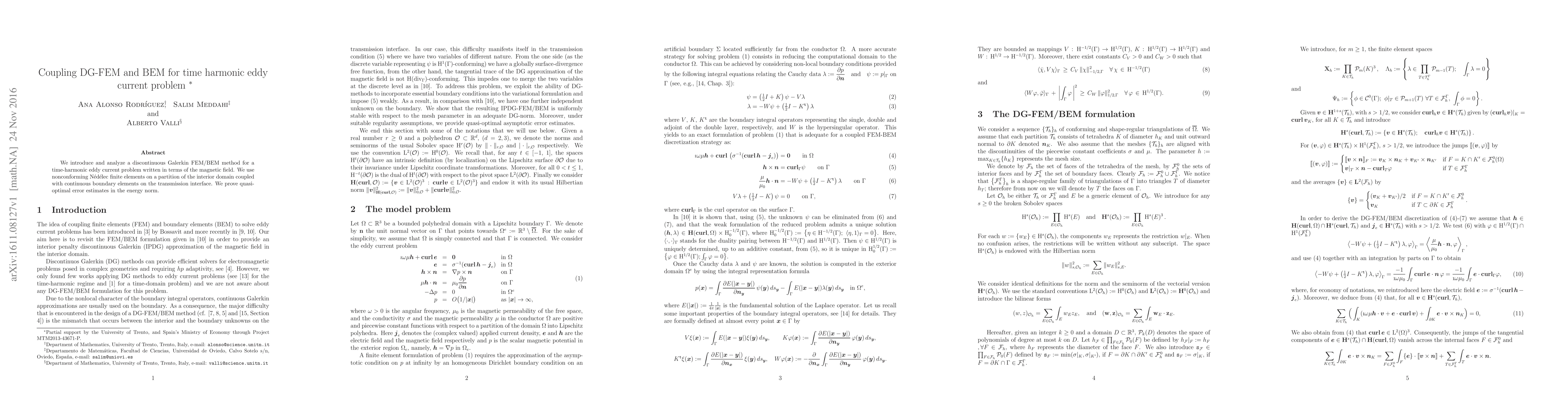 This paper presents a novel discontinuous Galerkin FEM/BEM method for solving time-harmonic eddy current problems, utilizing nonconforming Nédélec elements and continuous boundary elements. The authors provide quasi-optimal error estimates in the energy norm, demonstrating the method's effectiveness.