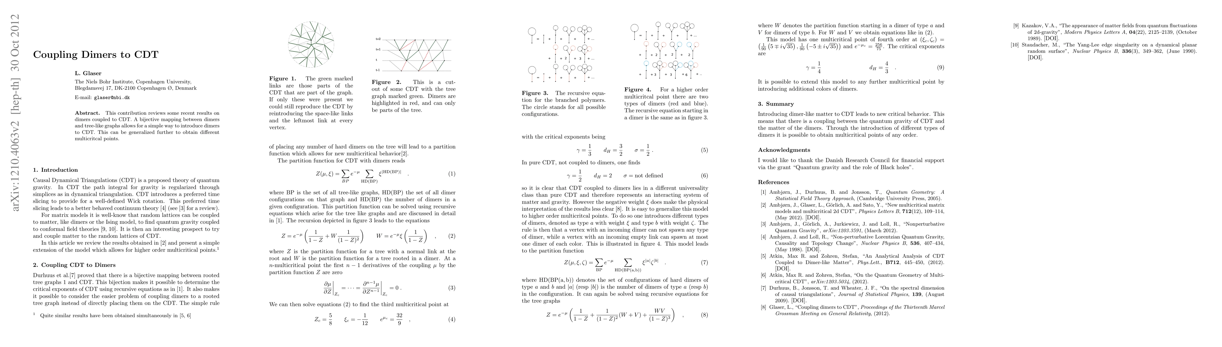 Summary: This paper reviews recent findings on dimers integrated with CDT, utilizing a bijective mapping to link dimers with tree-like graphs, facilitating the introduction of dimers and extending to various multicritical points.