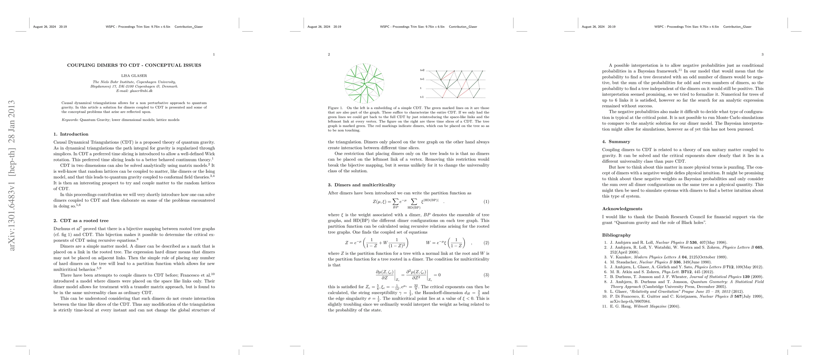 Causal dynamical triangulations allows for a non perturbative approach to quantum gravity. In this article a solution for dimers coupled to CDT is presented and some of the conceptual problems that arise are reflected upon.