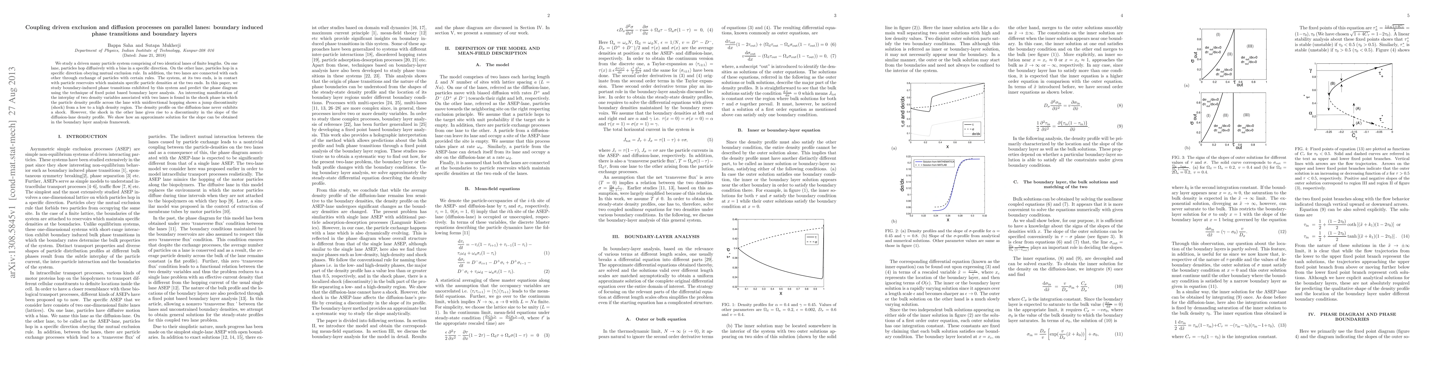 We study a driven many particle system comprising of two identical lanes of finite lengths. On one lane, particles hop diffusively with a bias in a specific direction. On the other lane, particles hop in a specific direction obeying mutual exclusion rule. In addition, the two lanes are connected with each other through exchange of particles with certain rules. The system, at its two ends, is in contact with particle reservoirs which maintain specific particle densities at the two ends. In this paper, we study boundary-induced phase transitions exhibited by this system and predict the phase diagram using the technique of fixed point based boundary layer analysis. An interesting manifestation of the interplay of two density variables associated with two lanes is found in the shock phase in which the particle density profile across the lane with unidirectional hopping shows a jump discontinuity (shock) from a low- to a high-density region. The density profile on the diffusion-lane never exhibits a shock. However, the shock in the other lane gives rise to a discontinuity in the slope of the diffusion-lane density profile. We show how an approximate solution for the slope can be obtained in the boundary layer analysis framework.