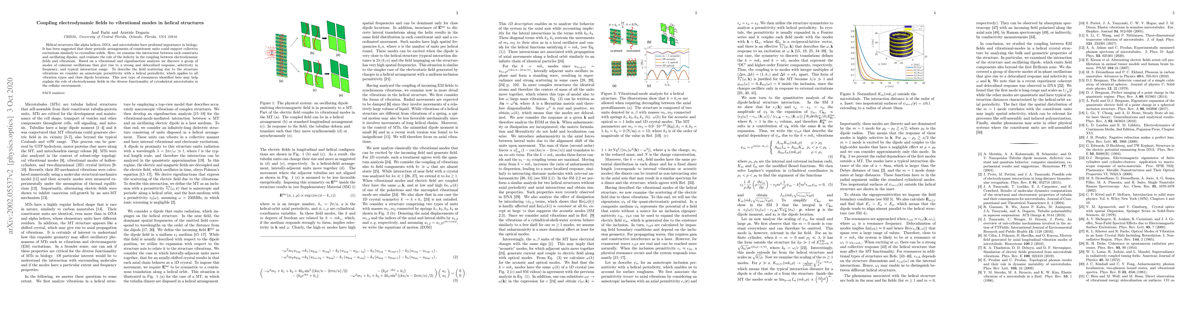 Helical structures like alpha helices, DNA, and microtubules have profound importance in biology. It has been suggested that these periodic arrangements of constituent units could support collective excitations similarly to crystalline solids. Here, we examine the interaction between such constructs and oscillating dipoles, and evaluate the role of the helicity in the coupling between electrodynamic fields and vibrations. Based on a vibrational and eigenfunction analyses we discover a group of modes of coherent oscillations that give rise to a strong and delocalized response, selectivity in frequency, and typical interaction range. To describe the field scattering due to the structure vibrations we consider an anisotropic permittivity with a helical periodicity, which applies to all vibration types and close dipole locations. This new type of resonances identified here may help explain the role of electrodynamic fields in the diverse functionality of cytoskeletal microtubules in the cellular environment.