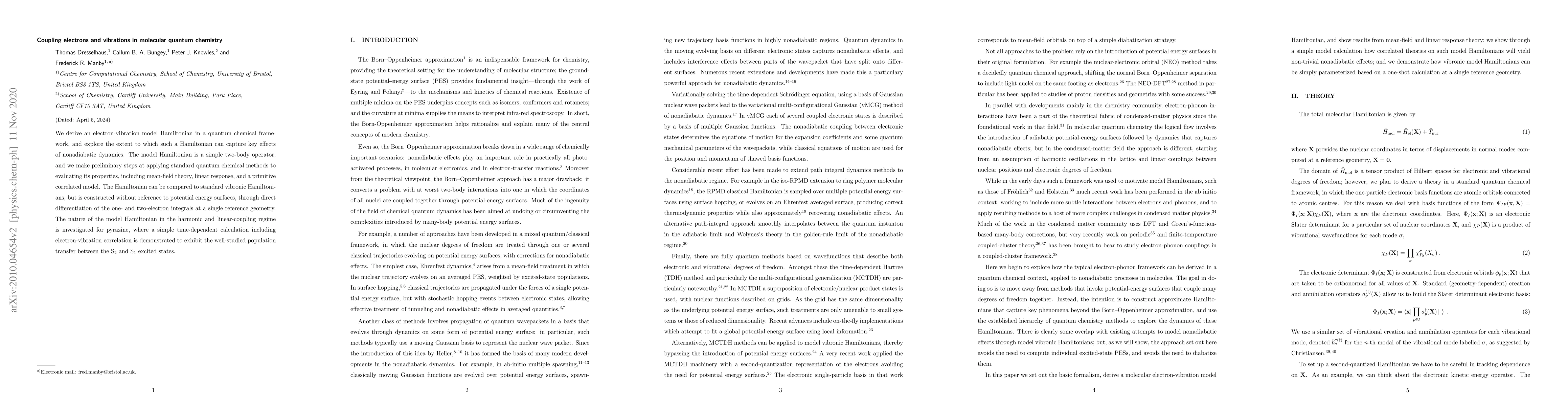 We derive an electron-vibration model Hamiltonian in a quantum chemical framework, and explore the extent to which such a Hamiltonian can capture key effects of nonadiabatic dynamics. The model Hamiltonian is a simple two-body operator, and we make preliminary steps at applying standard quantum chemical methods to evaluating its properties, including mean-field theory, linear response, and a primitive correlated model. The Hamiltonian can be compared to standard vibronic Hamiltonians, but is constructed without reference to potential energy surfaces, through direct differentiation of the one- and two-electron integrals at a single reference geometry. The nature of the model Hamiltonian in the harmonic and linear-coupling regime is investigated for pyrazine, where a simple time-dependent calculation including electron-vibration correlation is demonstrated to exhibit the well-studied population transfer between the S$_2$ and S$_1$ excited states.