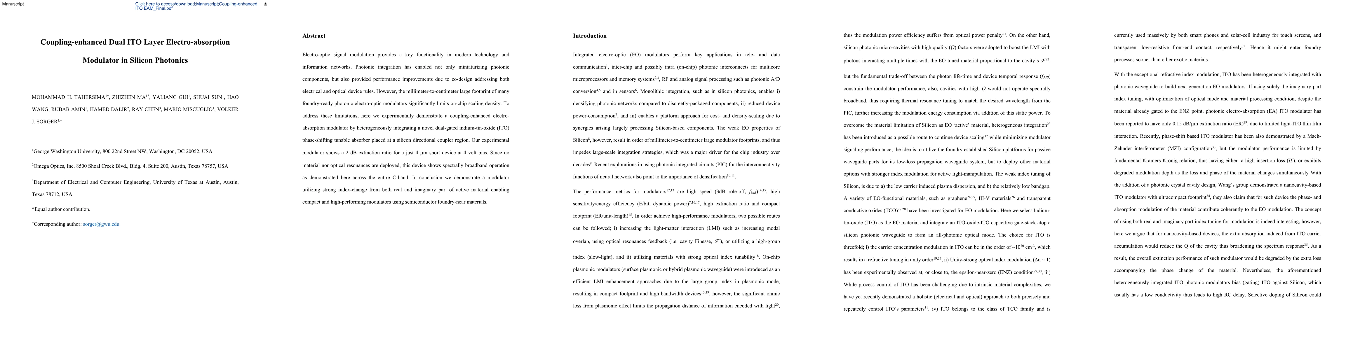 This research demonstrates a compact, high-performing electro-absorption modulator in silicon photonics using a novel dual-gated indium-tin-oxide layer. The modulator achieves a 2 dB extinction ratio in a 4 µm device with broadband operation across the C-band, enabling significant on-chip scaling density.