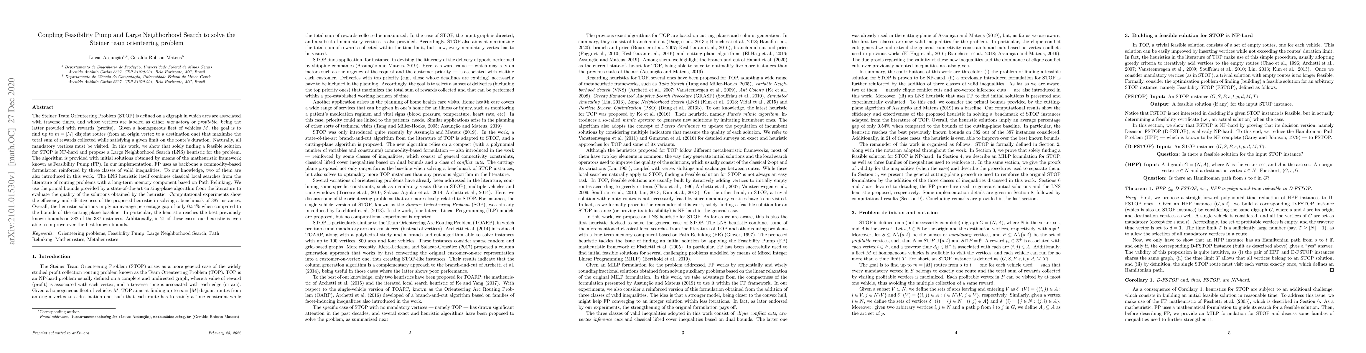 The Steiner Team Orienteering Problem (STOP) is defined on a digraph in which arcs are associated with traverse times, and whose vertices are labeled as either mandatory or profitable, being the latter provided with rewards (profits). Given a homogeneous fleet of vehicles M, the goal is to find up to m = |M| disjoint routes (from an origin vertex to a destination one) that maximize the total sum of rewards collected while satisfying a given limit on the route's duration. Naturally, all mandatory vertices must be visited. In this work, we show that solely finding a feasible solution for STOP is NP-hard and propose a Large Neighborhood Search (LNS) heuristic for the problem. The algorithm is provided with initial solutions obtained by means of the matheuristic framework known as Feasibility Pump (FP). In our implementation, FP uses as backbone a commodity-based formulation reinforced by three classes of valid inequalities. To our knowledge, two of them are also introduced in this work. The LNS heuristic itself combines classical local searches from the literature of routing problems with a long-term memory component based on Path Relinking. We use the primal bounds provided by a state-of-the-art cutting-plane algorithm from the literature to evaluate the quality of the solutions obtained by the heuristic. Computational experiments show the efficiency and effectiveness of the proposed heuristic in solving a benchmark of 387 instances. Overall, the heuristic solutions imply an average percentage gap of only 0.54% when compared to the bounds of the cutting-plane baseline. In particular, the heuristic reaches the best previously known bounds on 382 of the 387 instances. Additionally, in 21 of these cases, our heuristic is even able to improve over the best known bounds.