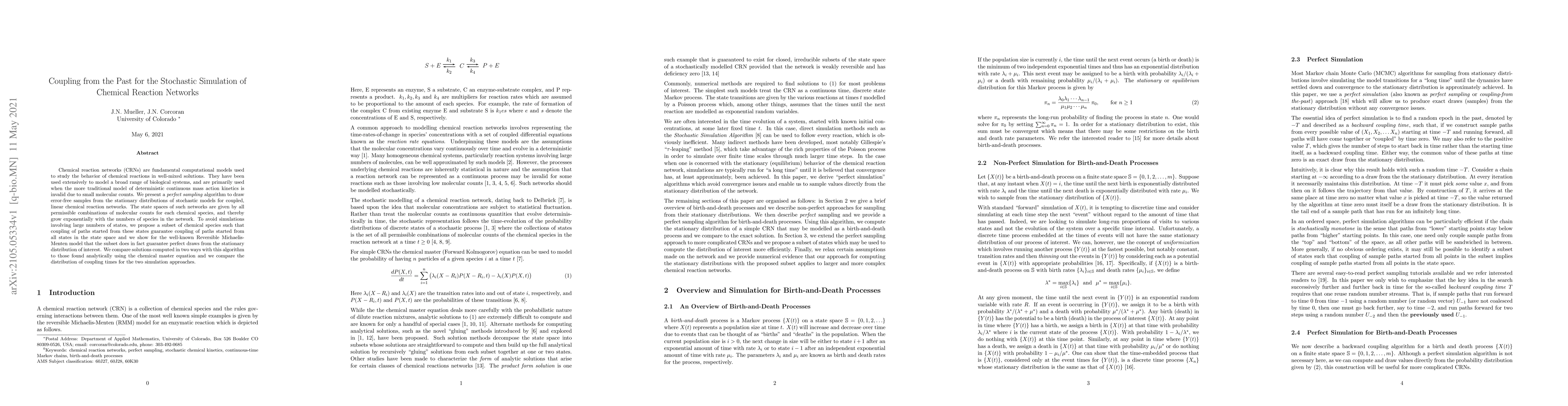 Chemical reaction networks (CRNs) are fundamental computational models used to study the behavior of chemical reactions in well-mixed solutions. They have been used extensively to model a broad range of biological systems, and are primarily used when the more traditional model of deterministic continuous mass action kinetics is invalid due to small molecular counts. We present a perfect sampling algorithm to draw error-free samples from the stationary distributions of stochastic models for coupled, linear chemical reaction networks. The state spaces of such networks are given by all permissible combinations of molecular counts for each chemical species, and thereby grow exponentially with the numbers of species in the network. To avoid simulations involving large numbers of states, we propose a subset of chemical species such that coupling of paths started from these states guarantee coupling of paths started from all states in the state space and we show for the well-known Reversible Michaelis-Menten model that the subset does in fact guarantee perfect draws from the stationary distribution of interest. We compare solutions computed in two ways with this algorithm to those found analytically using the chemical master equation and we compare the distribution of coupling times for the two simulation approaches.