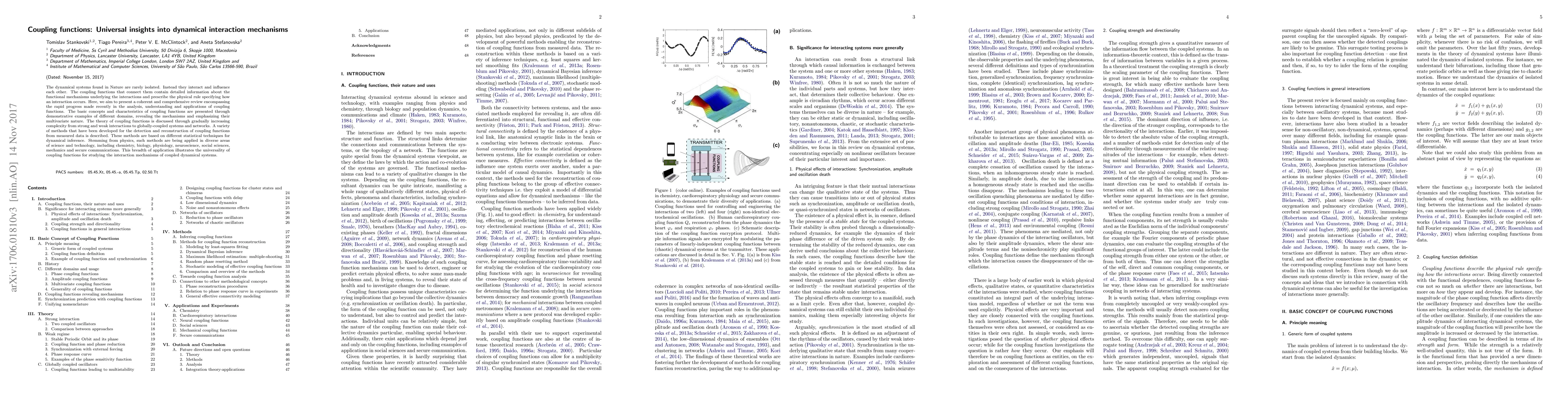 The dynamical systems found in Nature are rarely isolated. Instead they interact and influence each other. The coupling functions that connect them contain detailed information about the functional mechanisms underlying the interactions and prescribe the physical rule specifying how an interaction occurs. Here, we aim to present a coherent and comprehensive review encompassing the rapid progress made recently in the analysis, understanding and applications of coupling functions. The basic concepts and characteristics of coupling functions are presented through demonstrative examples of different domains, revealing the mechanisms and emphasizing their multivariate nature. The theory of coupling functions is discussed through gradually increasing complexity from strong and weak interactions to globally-coupled systems and networks. A variety of methods that have been developed for the detection and reconstruction of coupling functions from measured data is described. These methods are based on different statistical techniques for dynamical inference. Stemming from physics, such methods are being applied in diverse areas of science and technology, including chemistry, biology, physiology, neuroscience, social sciences, mechanics and secure communications. This breadth of application illustrates the universality of coupling functions for studying the interaction mechanisms of coupled dynamical systems.