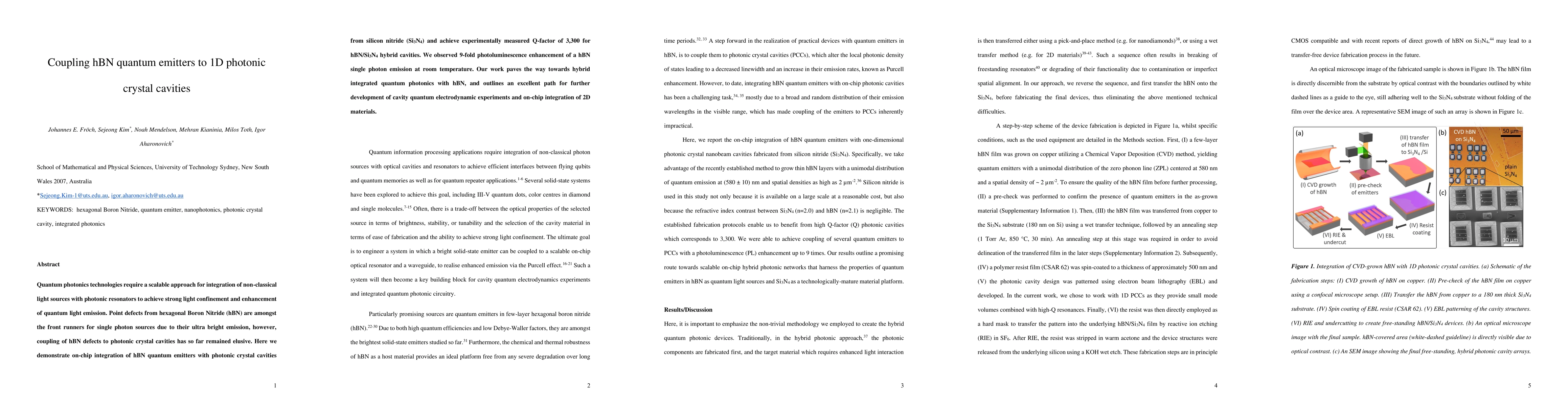 This paper demonstrates the successful integration of hBN quantum emitters with photonic crystal cavities made from silicon nitride, achieving a Q-factor of 3,300 and a 9-fold enhancement in photoluminescence, paving the way for hybrid quantum photonics technologies.