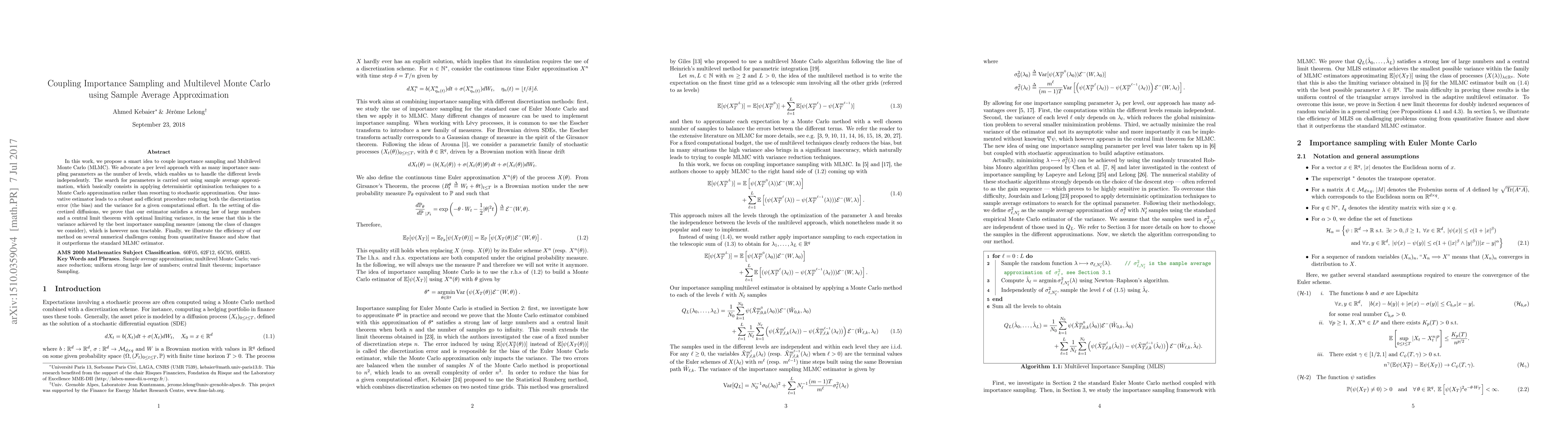 This paper proposes a novel coupling of importance sampling and Multilevel Monte Carlo (MLMC) using a per level approach with independent computation at each level. The method optimizes parameters using a deterministic optimization technique applied to a Monte Carlo approximation, achieving reduced bias and variance, and is shown to outperform standard MLMC in applications to quantitative finance.
