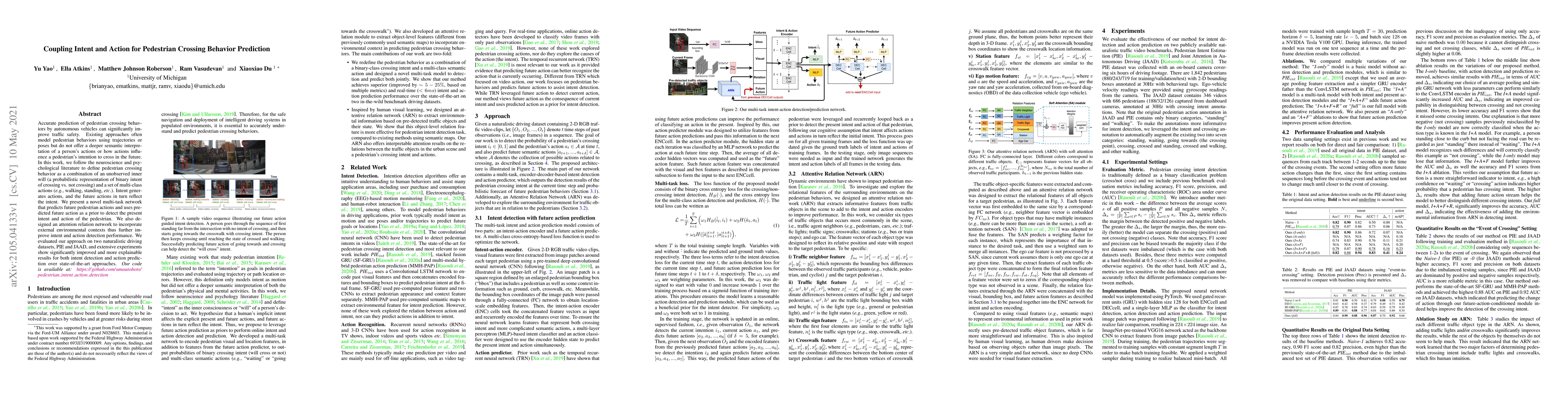 This paper proposes a novel multi-task network to predict pedestrian crossing behavior by coupling intent and action, using a probabilistic representation of intent and multi-class actions. The approach incorporates an attention relation network to enhance performance with environmental context, achieving superior results on two datasets.